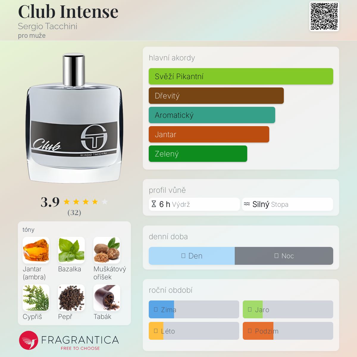 Club Intense podle Sergio Tacchini je Woody Spicy vůně pro muže. Club Intense byl/a uveden/a v roce 2015. Vrchní tóny jsou Bazalka, Černý pepř a Bergamot; střední tóny jsouMuškátový oříšek, Cypřiš a Tabák ; základní tóny jsou Jantar (ambra), Cedr a Pačuli.