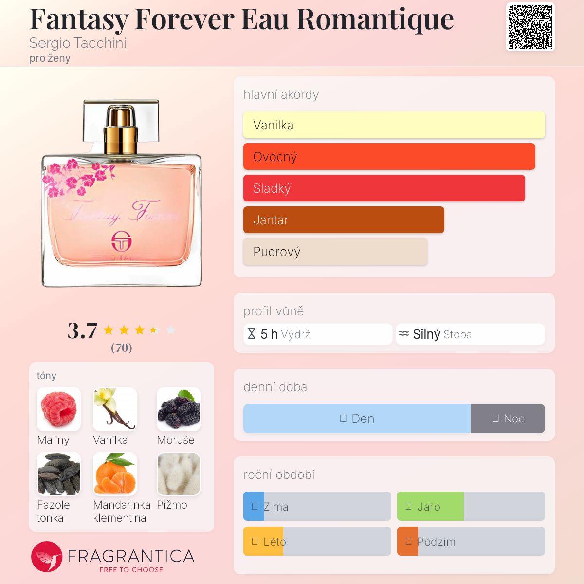 Fantasy Forever Eau Romantique podle Sergio Tacchini je Floral Fruity vůně pro ženy. Fantasy Forever Eau Romantique byl/a uveden/a v roce 2015. Vrchní tóny jsou Maliny, Mandarinka klementina a Bergamot; střední tóny jsouMoruše, Benzoin a Pivoňka ; základní tóny jsou Vanilka, Fazole tonka a Pižmo.