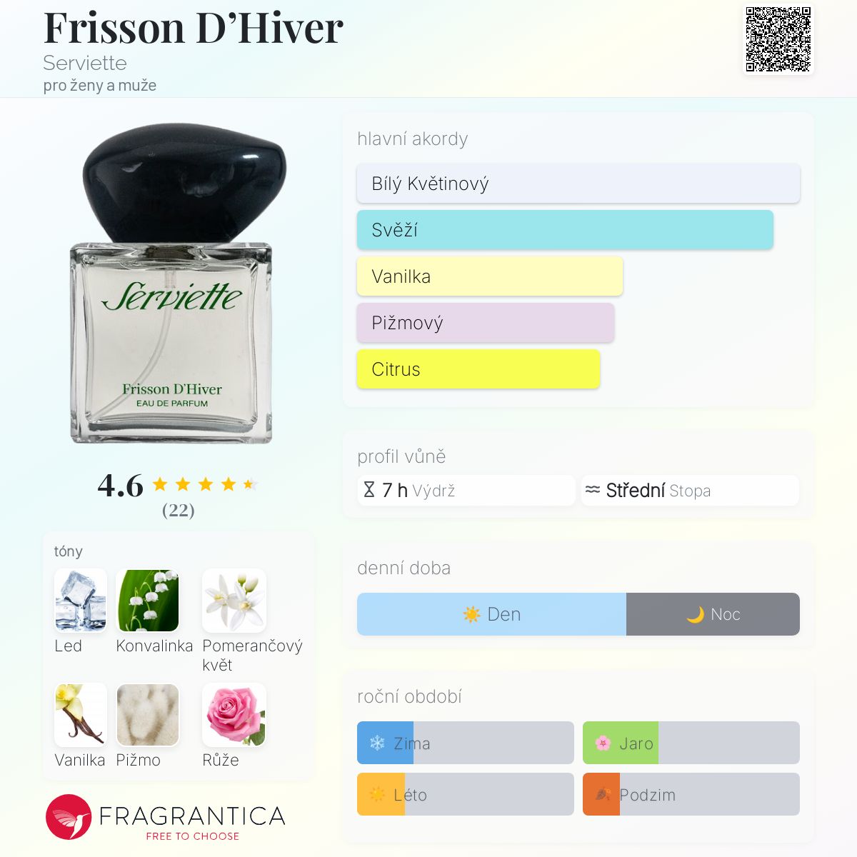 Frisson DʼHiver podle Serviette je Floral vůně pro ženy a muže. Toto je nová vůně. Frisson DʼHiver byl/a uveden/a v roce 2025. "Nosem" za touto vůní je Trey Taylor. Vrchní tóny jsou Led, Pomerančový květ a Bergamot; střední tóny jsouKonvalinka, Růže a Jasmín ; základní tóny jsou Vanilka, Bílé pižmo a Labdanum.