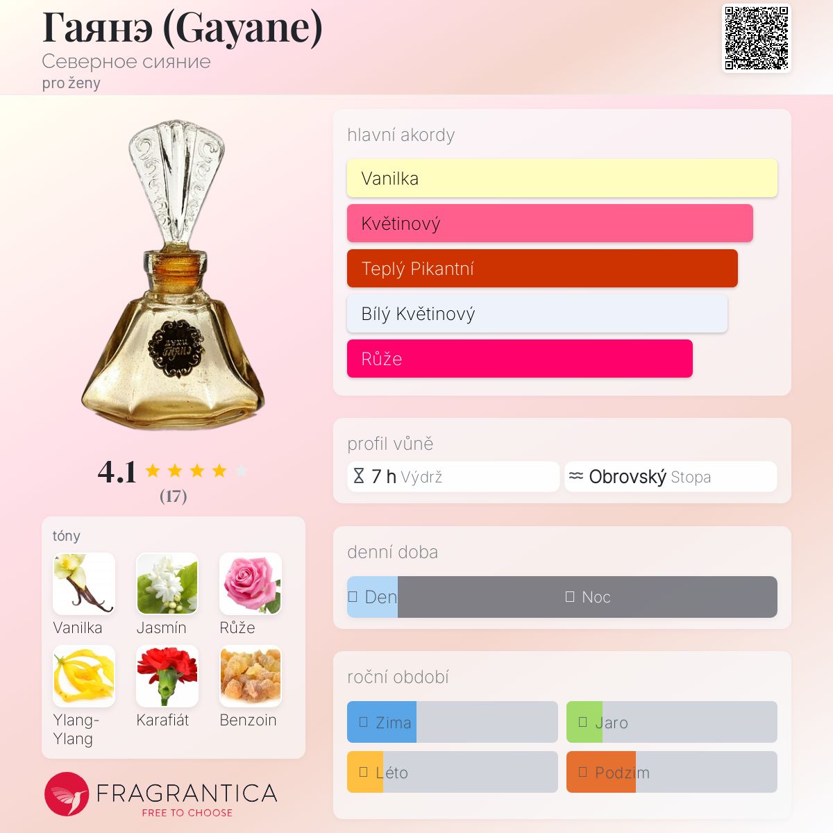 Гаянэ (Gayane) podle Северное сияние je Floral vůně pro ženy. Гаянэ (Gayane) byla spuštěna během 1960. "Nosem" za touto vůní je Valentina Zananyants. Vrchní tóny jsou Jasmín, Bergamot, Pomeranč a Pomerančový květ; střední tóny jsouVanilka, Růže, Ylang-Ylang, Karafiát a Kosatec ; základní tóny jsou Benzoin, Pačuli, Dubový mech a Syntetická cibetka.