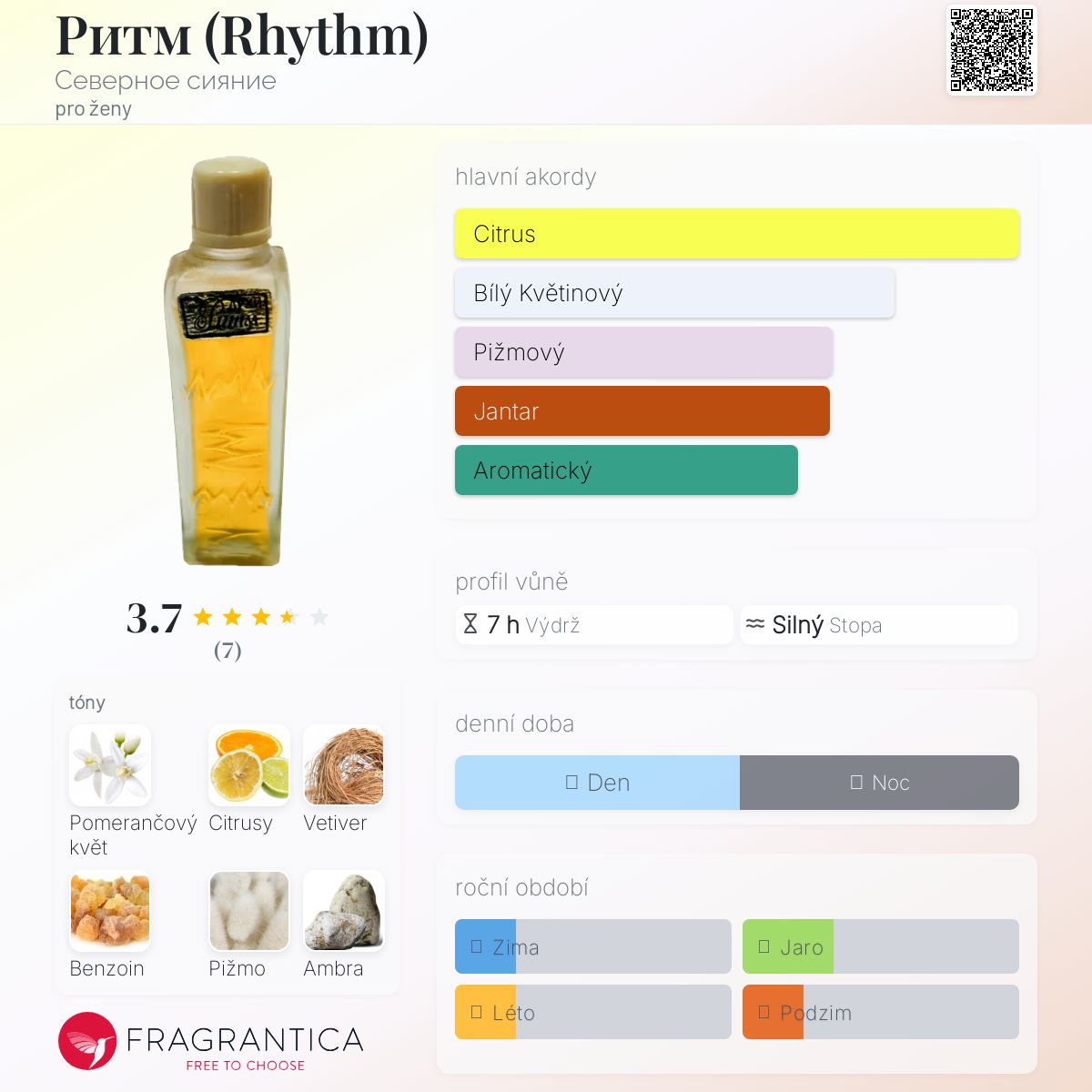 Ритм (Rhythm) podle Северное сияние je Chypre Floral vůně pro ženy. Ритм (Rhythm) byl/a uveden/a v roce 1978. "Nosem" za touto vůní je Marina Somova. Vrchní tóny jsou Pomerančový květ, Citrusy a Konvalinka; střední tóny jsouVetiver, Růže a Jetel ; základní tóny jsou Benzoin, Přírodní pižmo, Ambra, Cibetka, Fazole tonka a Kastoreum.