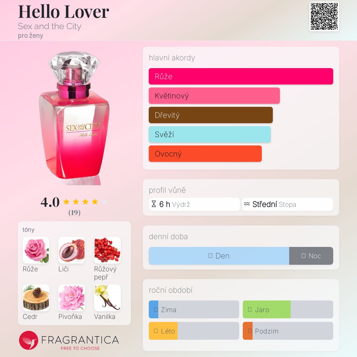 Hello Lover podle Sex and the City je Orientální Floral vůně pro ženy. Hello Lover byl/a uveden/a v roce 2013. Vrchní tóny jsou Liči, Růžový pepř a Mandarinka; střední tóny jsouKvětná růže, Divoká pivoňka a Zimolez ; základní tóny jsou Cedr, Vanilka, Santalové dřevo a Jantar (ambra).