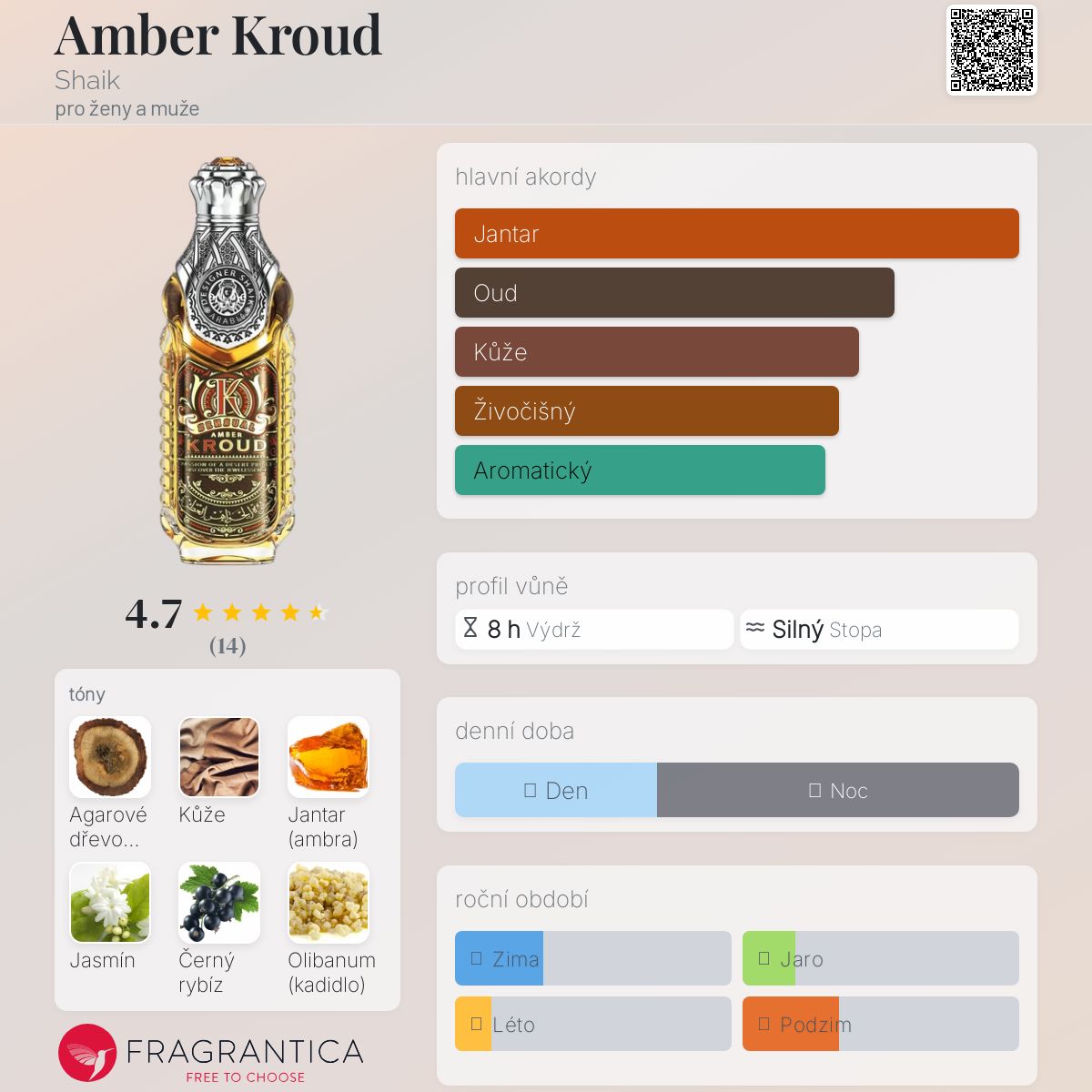 Amber Kroud podle Shaik je Orientální Woody vůně pro ženy a muže. Toto je nová vůně. Amber Kroud byl/a uveden/a v roce 2024. Vrchní tóny jsou Černý rybíz, Koření a Mango; střední tóny jsouJasmín, Růže a Ovocné tóny ; základní tóny jsou Agarové dřevo (oud), Kůže, Jantar (ambra), Kadidlo, Fazole tonka, Vetiver, Pižmo a Vanilka.