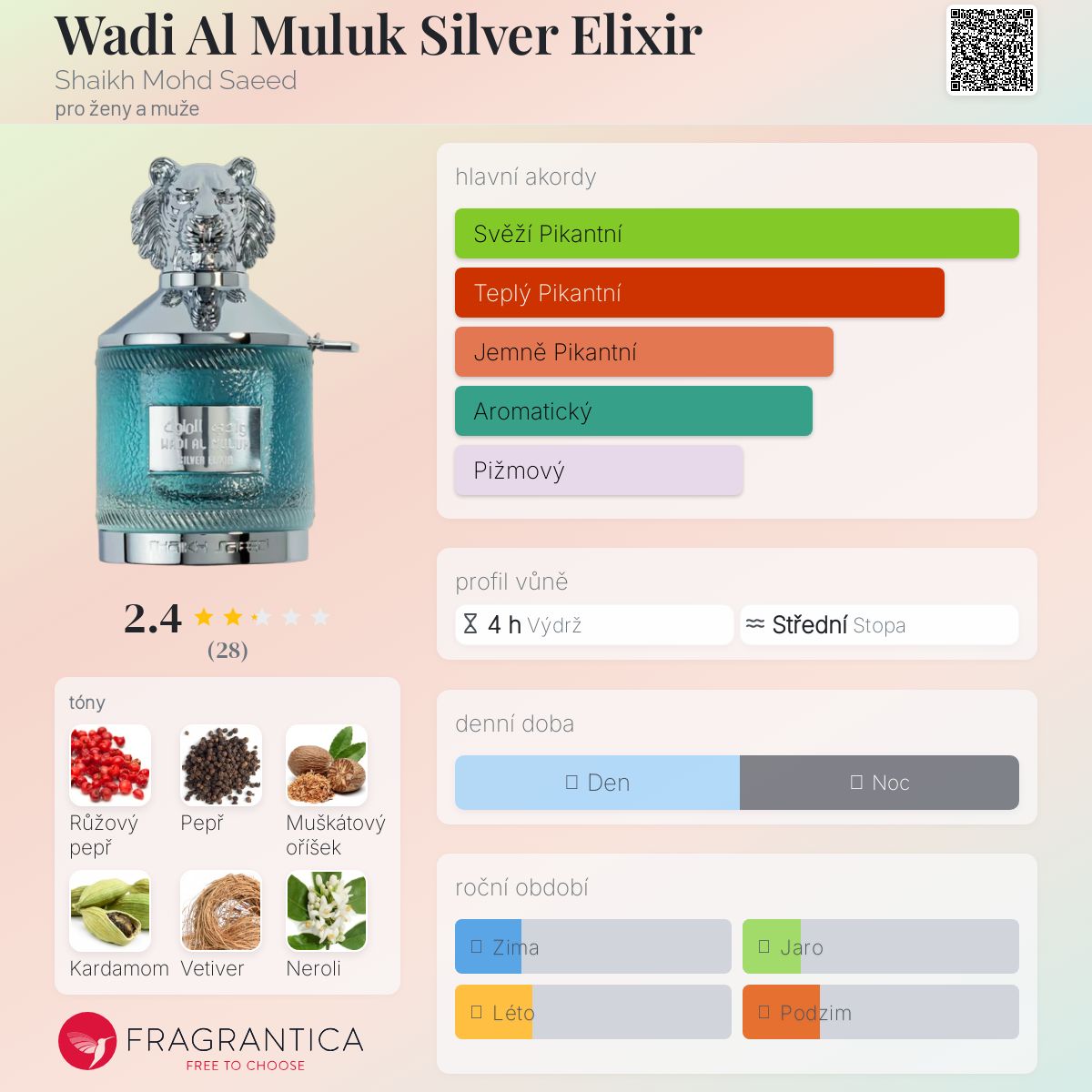 Wadi Al Muluk Silver Elixir podle Shaikh Mohd Saeed je vůně pro ženy a muže. Toto je nová vůně. Wadi Al Muluk Silver Elixir byl/a uveden/a v roce 2025. Vrchní tóny jsou Bergamot, Pomeranč a Mandarinka; střední tóny jsouRůžový pepř a Pepř ; základní tóny jsou Muškátový oříšek, Kardamom, Vetiver a Neroli.
