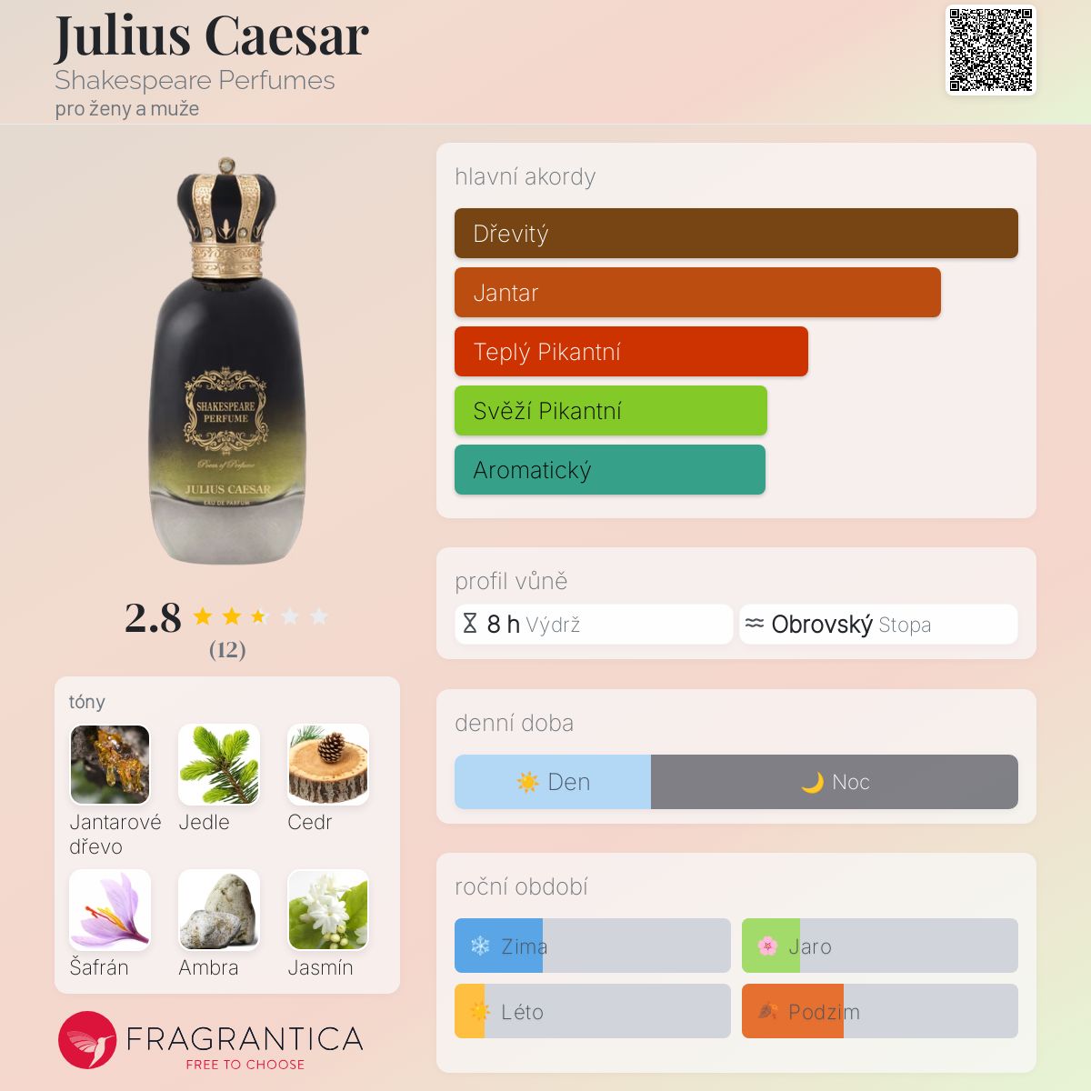 Julius Caesar podle Shakespeare Perfumes je Orientální Floral vůně pro ženy a muže. Julius Caesar byl/a uveden/a v roce 2018. Vrchní tóny jsou Šafrán a Jasmín; střední tóny jsouJantarové dřevo a Ambra ; základní tóny jsou Jedlová pryskyřice a Cedr.