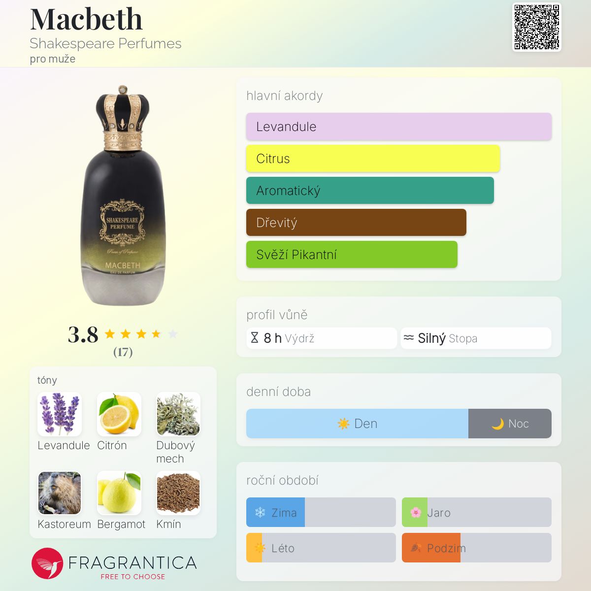 Macbeth podle Shakespeare Perfumes je Woody Spicy vůně pro muže. Macbeth byl/a uveden/a v roce 2017. Vrchní tóny jsou Levandule, Citrón, Bergamot, Kmín a Estragon; střední tóny jsouJasmín, Konvalinka a Fialka ; základní tóny jsou Dubový mech, Kastoreum, Cedr, Hřebíček, Galbanum, Pačuli, Dřevité tóny, Ambra, Kůže, Fazole tonka, Vanilka, Rebarbora, Vetiver a Pižmo.