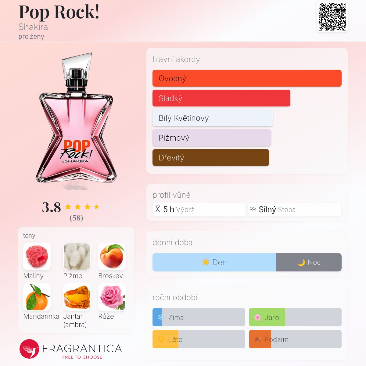 Pop Rock! podle Shakira je Floral Fruity vůně pro ženy. Pop Rock! byl/a uveden/a v roce 2016. Vrchní tóny jsou Broskev, Mandarinka, Hruška a Černý rybíz; střední tóny jsouMaliny, Bulharská růže, Jasmín a Gardénie ; základní tóny jsou Pižmo, Jantar (ambra), Pačuli a Cedr.