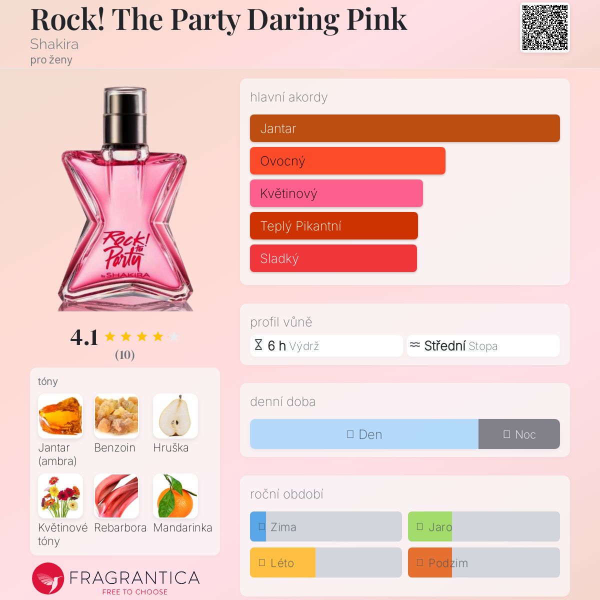 Rock! The Party Daring Pink podle Shakira je Floral Fruity vůně pro ženy. Rock! The Party Daring Pink byl/a uveden/a v roce 2017. Vrchní tóny jsou Hruška, Rebarbora a Mandarinka; střední tón jeKvětinové tóny ; základní tóny jsou Jantar (ambra) a Benzoin.