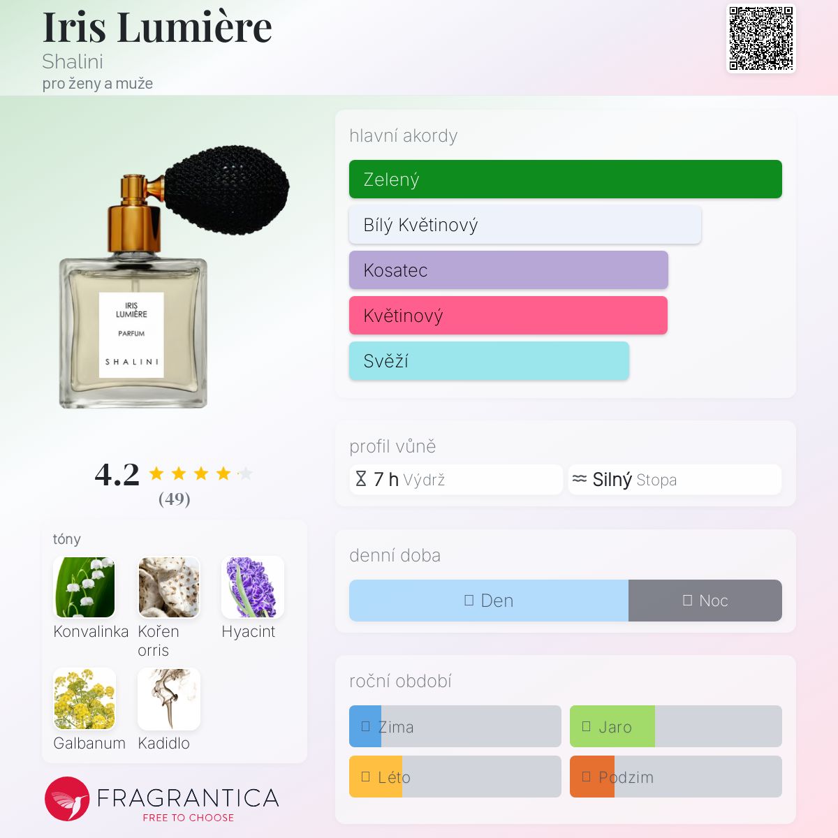 Iris Lumière podle Shalini je Floral Woody Musk vůně pro ženy a muže. Iris Lumière byl/a uveden/a v roce 2020. "Nosem" za touto vůní je Maurice Roucel.