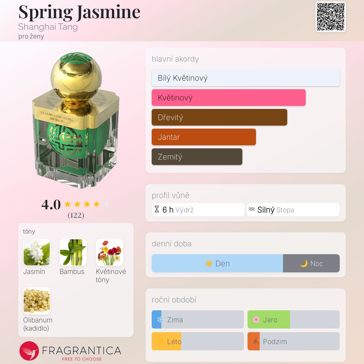 Spring Jasmine podle Shanghai Tang je Floral vůně pro ženy. Spring Jasmine byl/a uveden/a v roce 2014. "Nosem" za touto vůní je Carlos Benaïm. Vrchní tón je Bambus ; střední tóny jsouJasmín a Květiny ; základní tón je Olibanum.