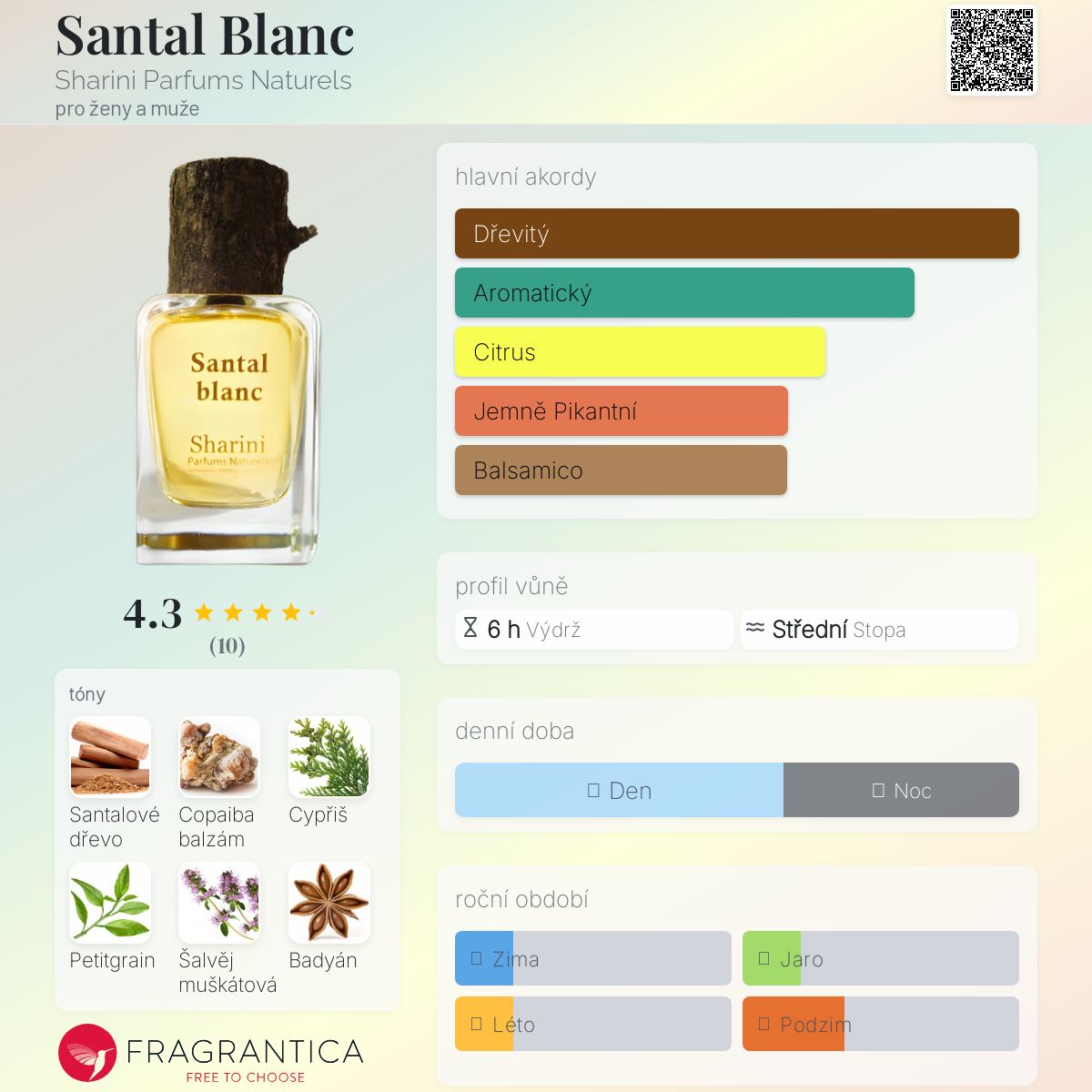 Santal Blanc podle Sharini Parfums Naturels je Woody Aromatic vůně pro ženy a muže. "Nosem" za touto vůní je Nicolas Jennings. Vrchní tóny jsou Badyán, Mandarinka a Bergamot; střední tóny jsouPetitgrain, Šalvěj muškátová a Ylang-Ylang ; základní tóny jsou Santalové dřevo, Copaiba balzám, Cypřiš, Vetiver a Labdanum.