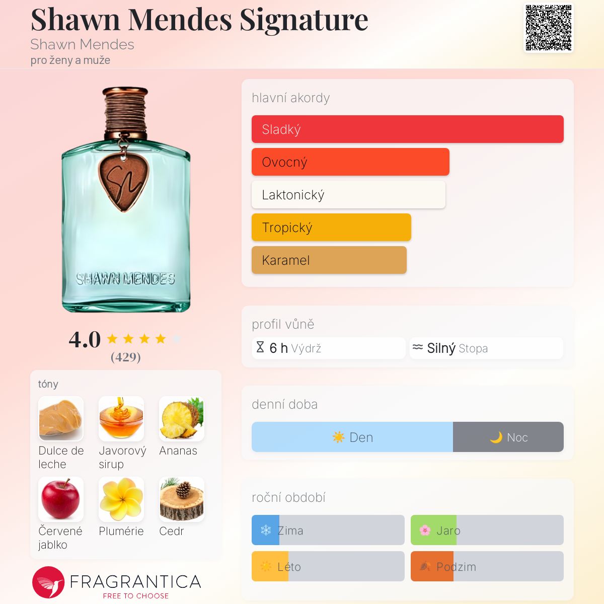 Shawn Mendes Signature podle Shawn Mendes je Orientální Vanilla vůně pro ženy a muže. Shawn Mendes Signature byl/a uveden/a v roce 2017. "Nosem" za touto vůní je Celine Barel. Vrchní tóny jsou Ananas, Červené jablko a Citrón; střední tóny jsouJavorová míza, Plumérie a Růže ; základní tóny jsou Dulce de leche, Extrakt z bílého cedru a Pižmo.