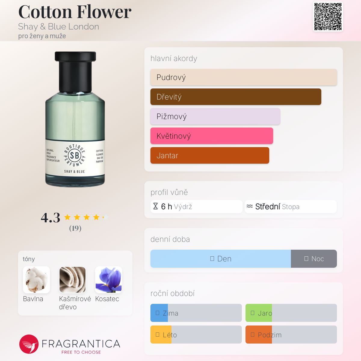 Cotton Flower podle Shay & Blue London je Floral vůně pro ženy a muže. Cotton Flower byl/a uveden/a v roce 2022. "Nosem" za touto vůní je Julie Massé. Vrchní tón je Bavlna ; střední tón jeKosatec ; základní tón je Kašmírové dřevo.