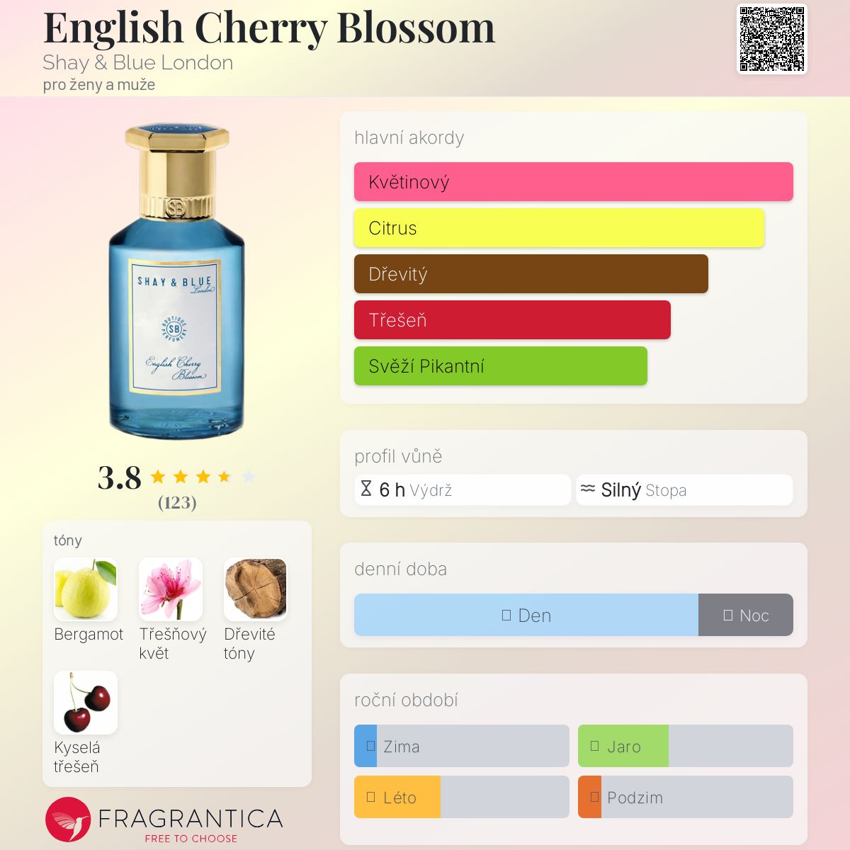 English Cherry Blossom podle Shay & Blue London je Floral vůně pro ženy a muže. English Cherry Blossom byl/a uveden/a v roce 2016. "Nosem" za touto vůní je Julie Massé. Vrchní tóny jsou Bergamot a Třešňový květ; střední tón jeKyselá třešeň ; základní tón je Dřevité tóny.