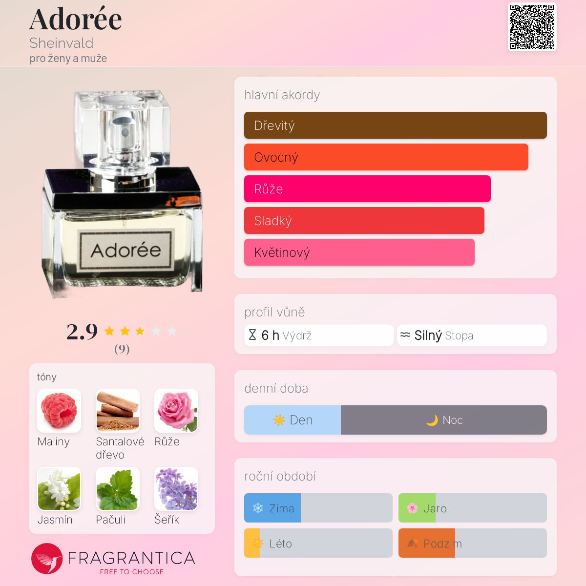 Adorée podle Sheinvald je vůně pro ženy a muže. Adorée byl/a uveden/a v roce 2017. "Nosem" za touto vůní je Shay Sheinvald. Vrchní tóny jsou Maliny, Zelená mandarinka a Grapefruit; střední tóny jsouOkvětní lístky růží, Jasmín a Šeřík ; základní tóny jsou Santalové dřevo a Pačuli.