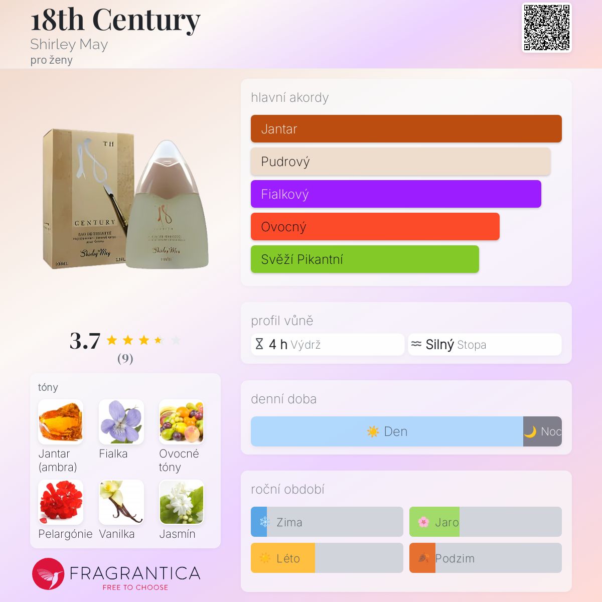 18th Century podle Shirley May je Orientální Floral vůně pro ženy. Vrchní tóny jsou Fialka, Pelargónie a Jasmín; střední tón jeOvocné tóny ; základní tóny jsou Jantar (ambra) a Vanilka.