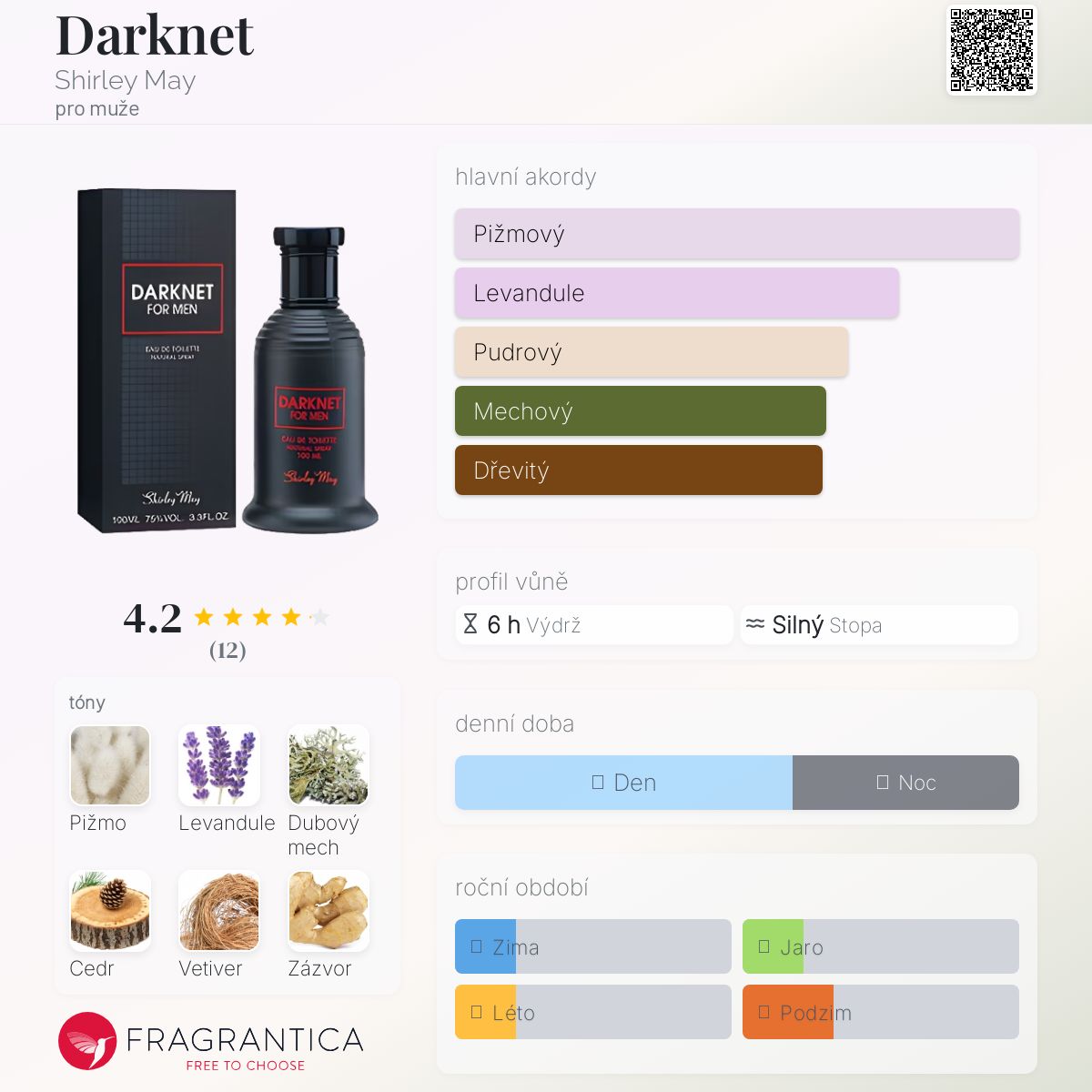 Darknet podle Shirley May je Woody Aromatic vůně pro muže. Vrchní tóny jsou Levandule, Cedr, Vetiver, Zázvor a Santalové dřevo; střední tóny jsouAnýz, Kardamom a Skořice ; základní tóny jsou Pižmo a Mech.