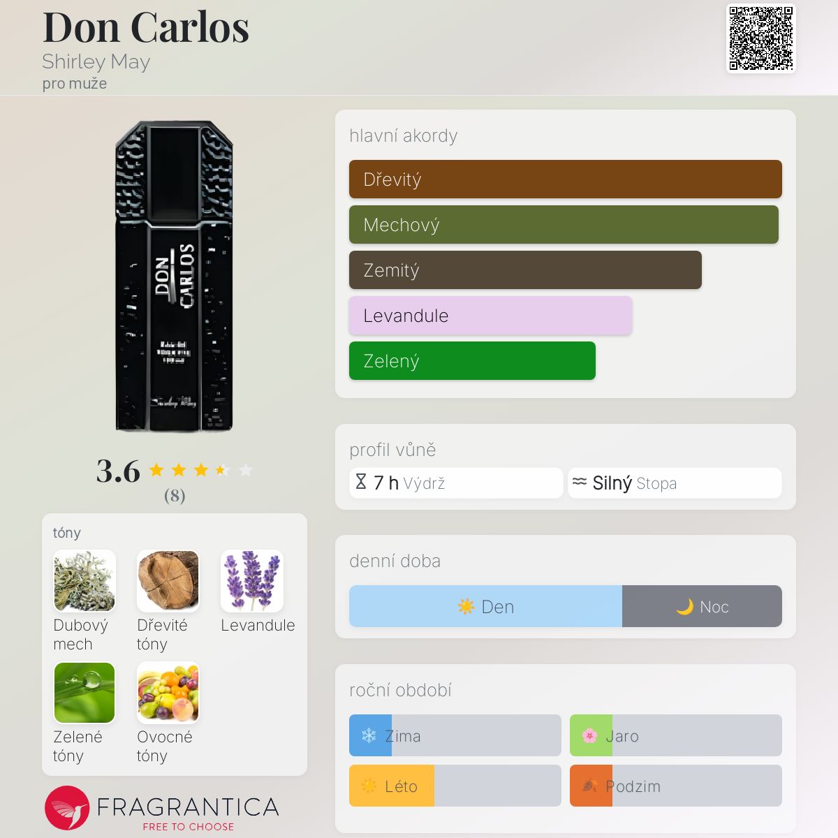 Don Carlos podle Shirley May je Aromatic Fougere vůně pro muže. Vrchní tón je Levandule ; střední tóny jsouBylinné tóny a Ovocné a kořeněné tóny ; základní tóny jsou Dubový mech a Dřevité tóny.