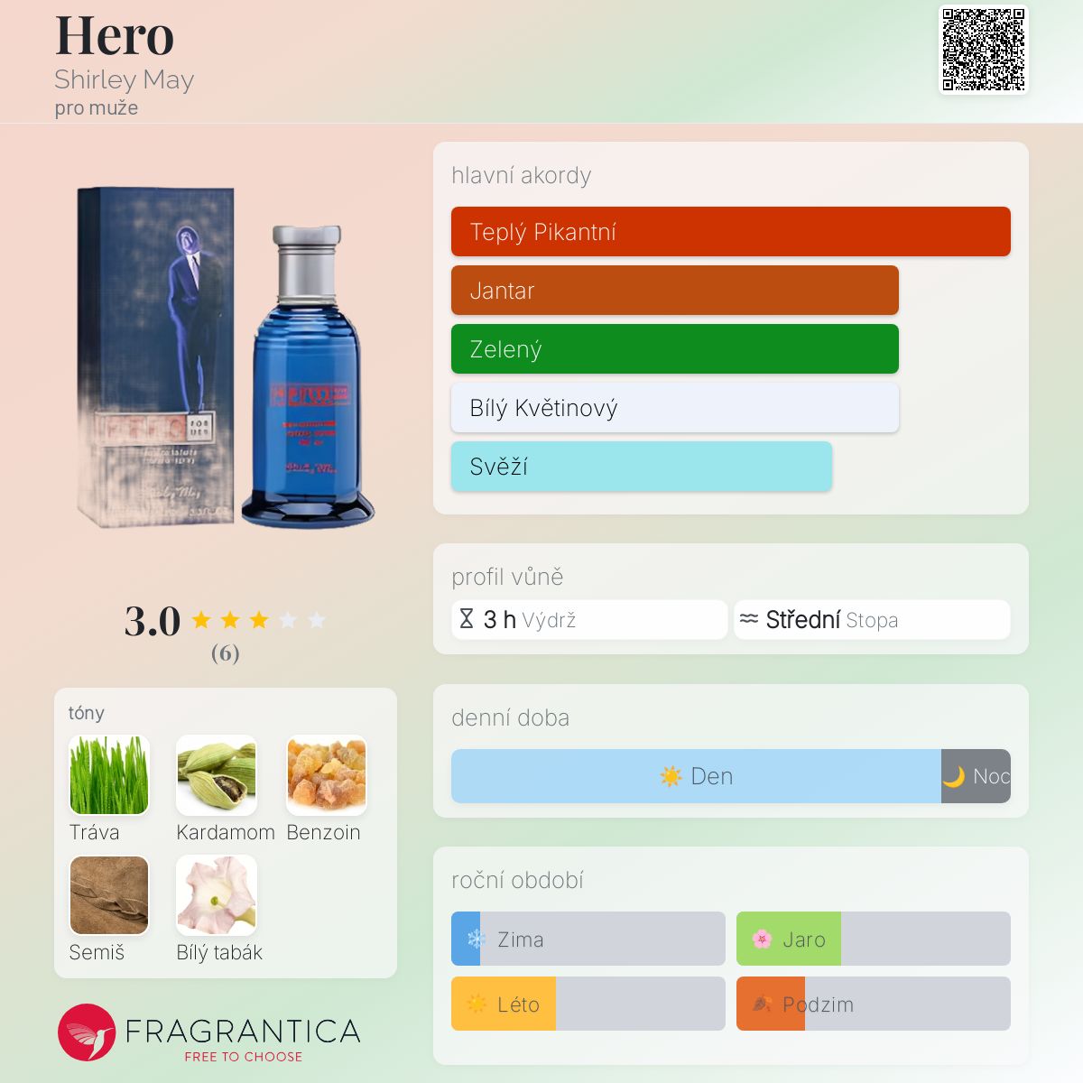 Hero podle Shirley May je Woody Spicy vůně pro muže. Vrchní tóny jsou Zelená tráva a Kardamom; střední tón jeBenzoin ; základní tóny jsou Semiš a Bílý tabák.