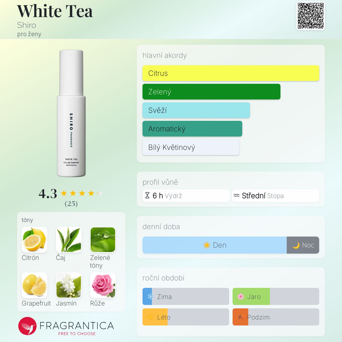 White Tea podle Shiro je Floral Woody Musk vůně pro ženy. White Tea byl/a uveden/a v roce 2016. Vrchní tóny jsou Citrón, Zelené tóny a Grapefruit; střední tóny jsouZelený čaj, Jasmín, Růže a Lilie ; základní tóny jsou Jantar (ambra), Pižmo a Dřevité tóny.
