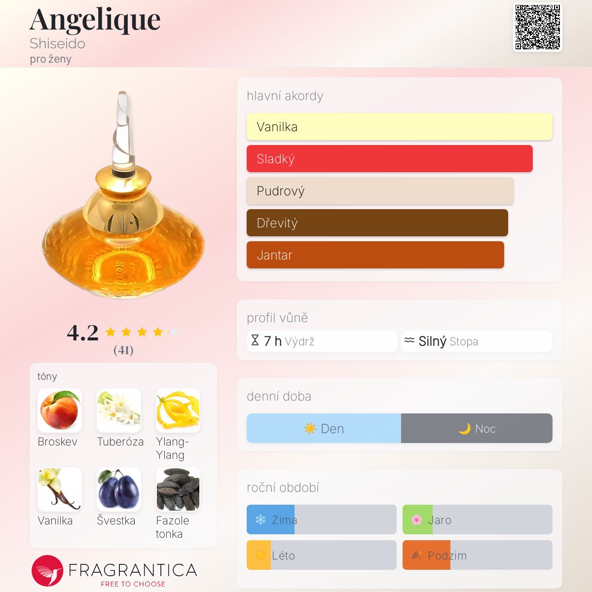 Angelique podle Shiseido je Orientální Floral vůně pro ženy. Angelique byl/a uveden/a v roce 1991. "Nosem" za touto vůní je Jean-Louis Sieuzac. Vrchní tóny jsou Broskev, Švestka, Grapefruit, Zelené tóny a Bergamot; střední tóny jsouTuberóza, Ylang-Ylang, Jasmín, Otočník, Orchidej, Růže a Karafiát ; základní tóny jsou Vanilka, Fazole tonka, Jantar (ambra), Benzoin, Cedr a Santalové dřevo.