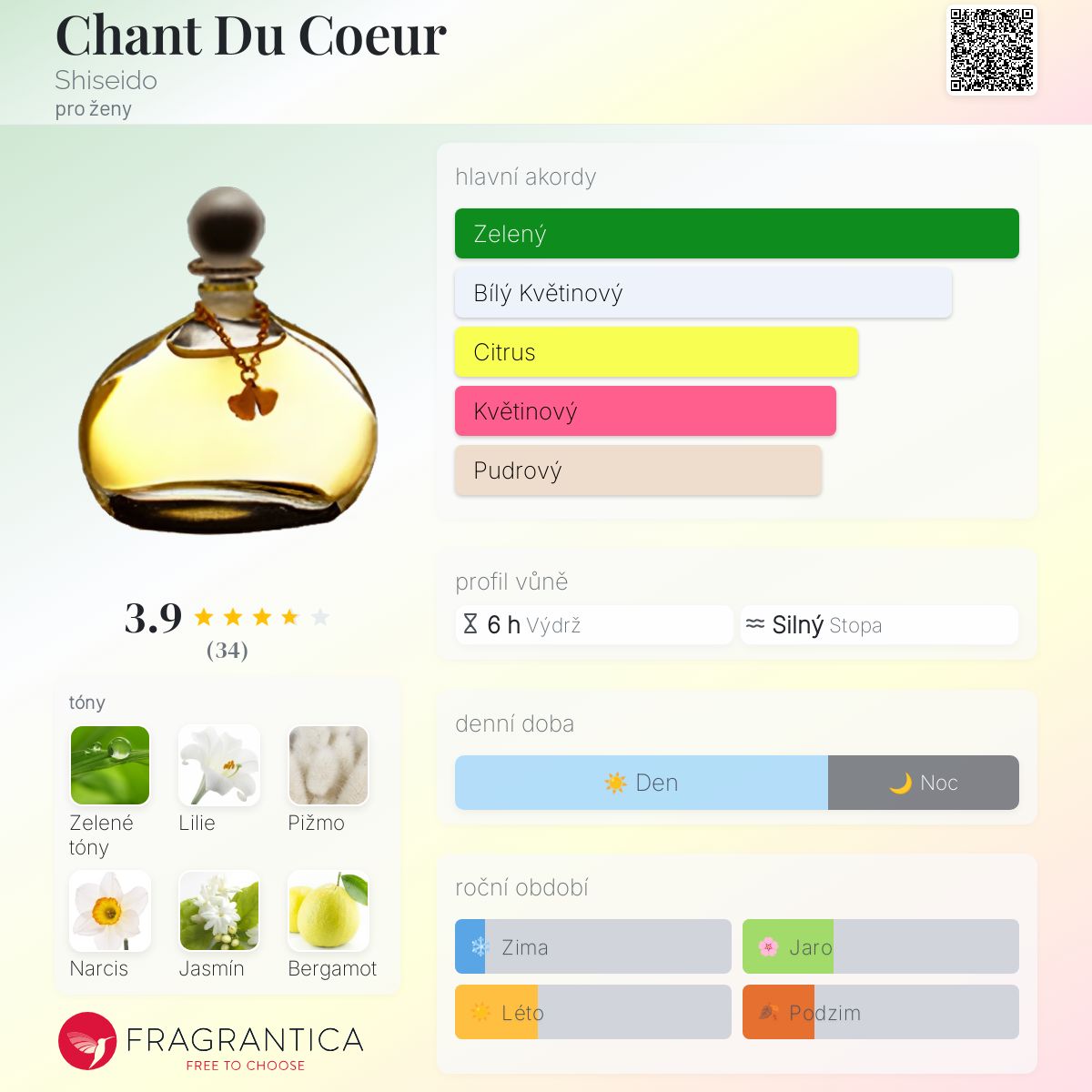 Chant Du Coeur podle Shiseido je Floral Green vůně pro ženy. Chant Du Coeur byl/a uveden/a v roce 1993. Vrchní tóny jsou Zelené tóny, Bergamot, Broskev, Hyacint a Citrón; střední tóny jsouLilie, Narcis, Jasmín, Růže a Kosatec ; základní tóny jsou Pižmo a Cedr.