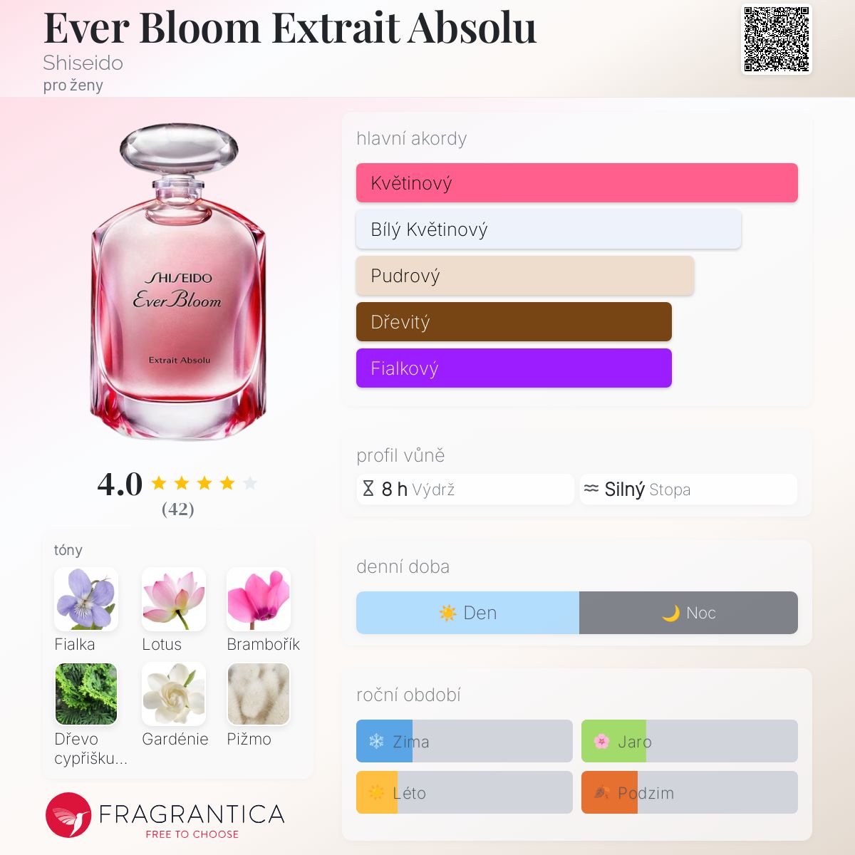 Ever Bloom Extrait Absolu podle Shiseido je Floral vůně pro ženy. Ever Bloom Extrait Absolu byl/a uveden/a v roce 2016. "Nosem" za touto vůní je Aurélien Guichard. Vrchní tóny jsou Fialka, Lotus, Brambořík a Růže; střední tóny jsouGardénie a Pomerančový květ ; základní tóny jsou Dřevo cypřišku tupolistého a Pižmo.