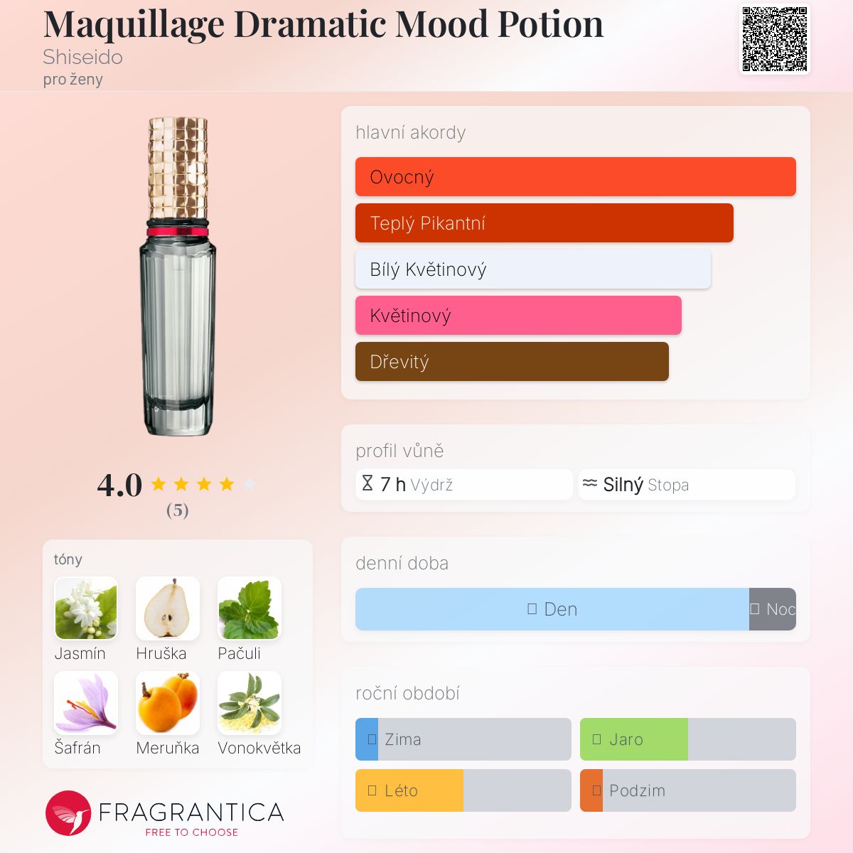 Maquillage Dramatic Mood Potion podle Shiseido je Orientální Floral vůně pro ženy. Maquillage Dramatic Mood Potion byl/a uveden/a v roce 2015. Vrchní tóny jsou Jasmín, Hruška, Pačuli, Meruňka, Jablko, Bergamot, Grapefruit, Maliny, Broskev a Kardamom; střední tóny jsouJasmín, Vonokvětka, Olivový květ, Konvalinka, Bulharská růže a Fialka ; základní tóny jsou Šafrán, Vanilka, Pižmo, Santalové dřevo, Cedr, Kosatec a Jantar (ambra).