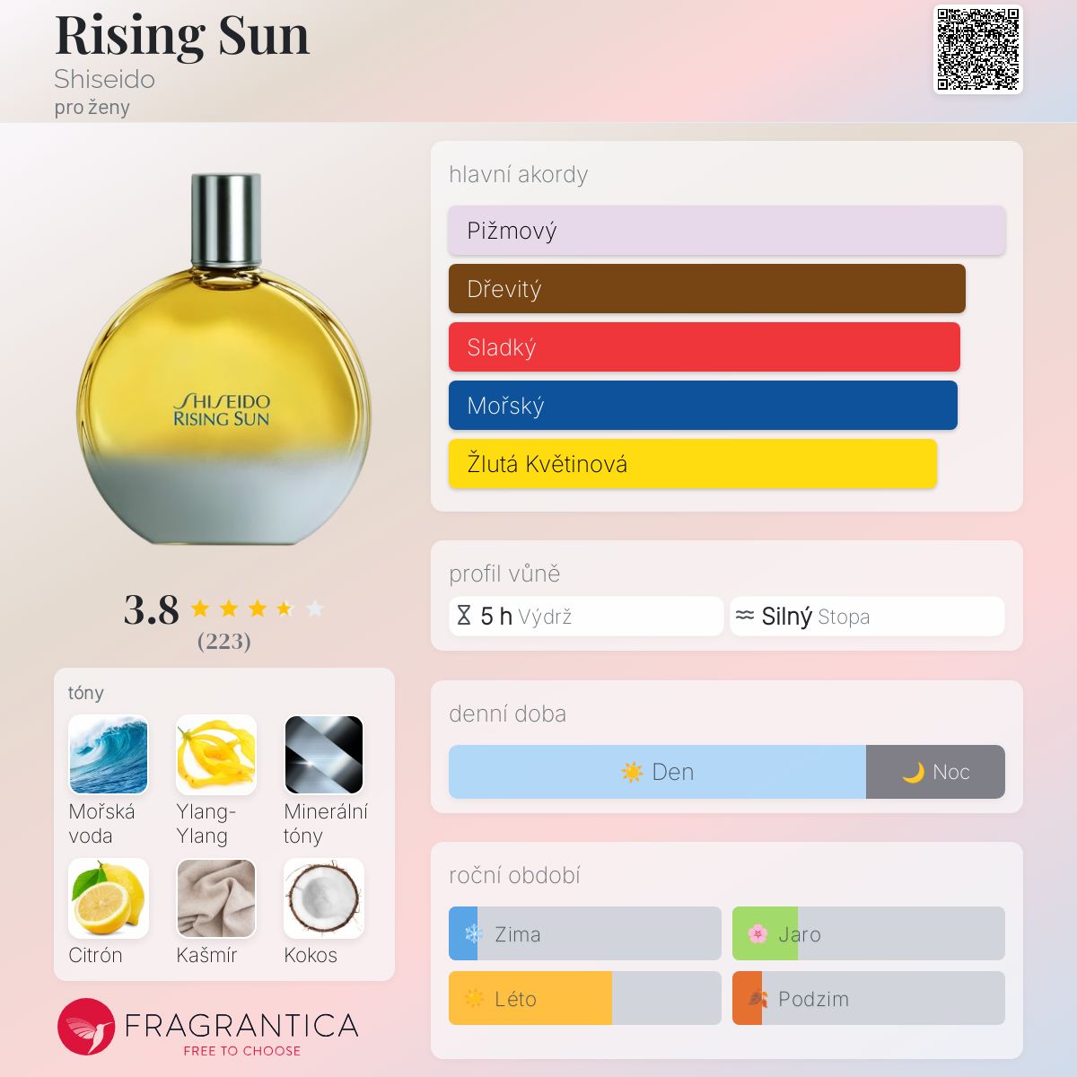 Rising Sun podle Shiseido je Floral Fruity vůně pro ženy. Rising Sun byl/a uveden/a v roce 2019. "Nosem" za touto vůní je Jean Jacques. Vrchní tóny jsou Mořské tóny, Minerální tóny a Citrón; střední tóny jsouYlang-Ylang, Jasmín a Růže ; základní tóny jsou Kašmír, Kokos, Pižmo a Švestka mirabelka.
