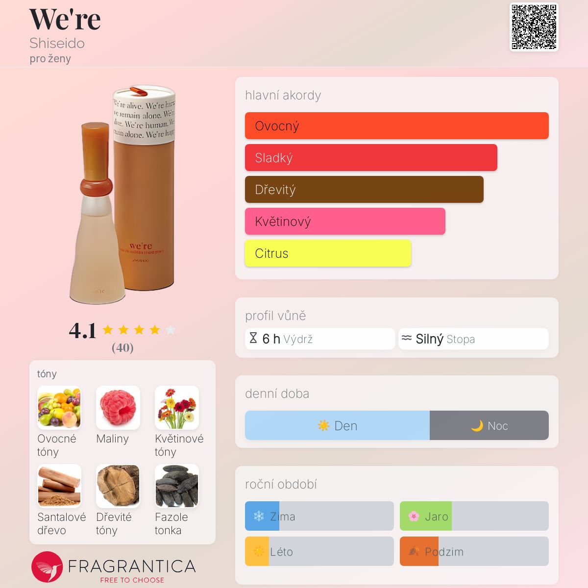 We're podle Shiseido je Floral Fruity vůně pro ženy. We're byl/a uveden/a v roce 1994. "Nosem" za touto vůní je Maurice Roucel. Vrchní tóny jsou Ovocné tóny, Maliny a Citrusy; střední tón jeKvětinové tóny ; základní tóny jsou Santalové dřevo, Dřevité tóny a Fazole tonka.