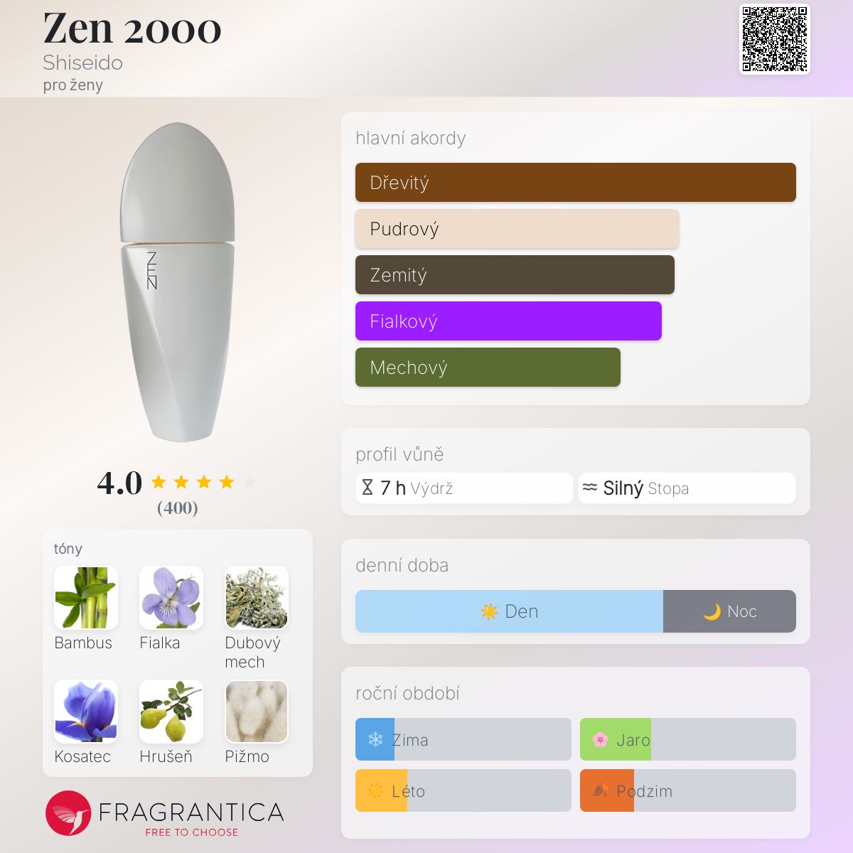 Zen 2000 podle Shiseido je Floral Woody Musk vůně pro ženy. Zen 2000 byl/a uveden/a v roce 2000. "Nosem" za touto vůní je Nathalie Lorson. Vrchní tóny jsou Bergamot a Hořec; střední tóny jsouFialka, Dubový mech, Kosatec a Růže ; základní tóny jsou Bambus, Hruškové dřevo, Pižmo a Pačuli.