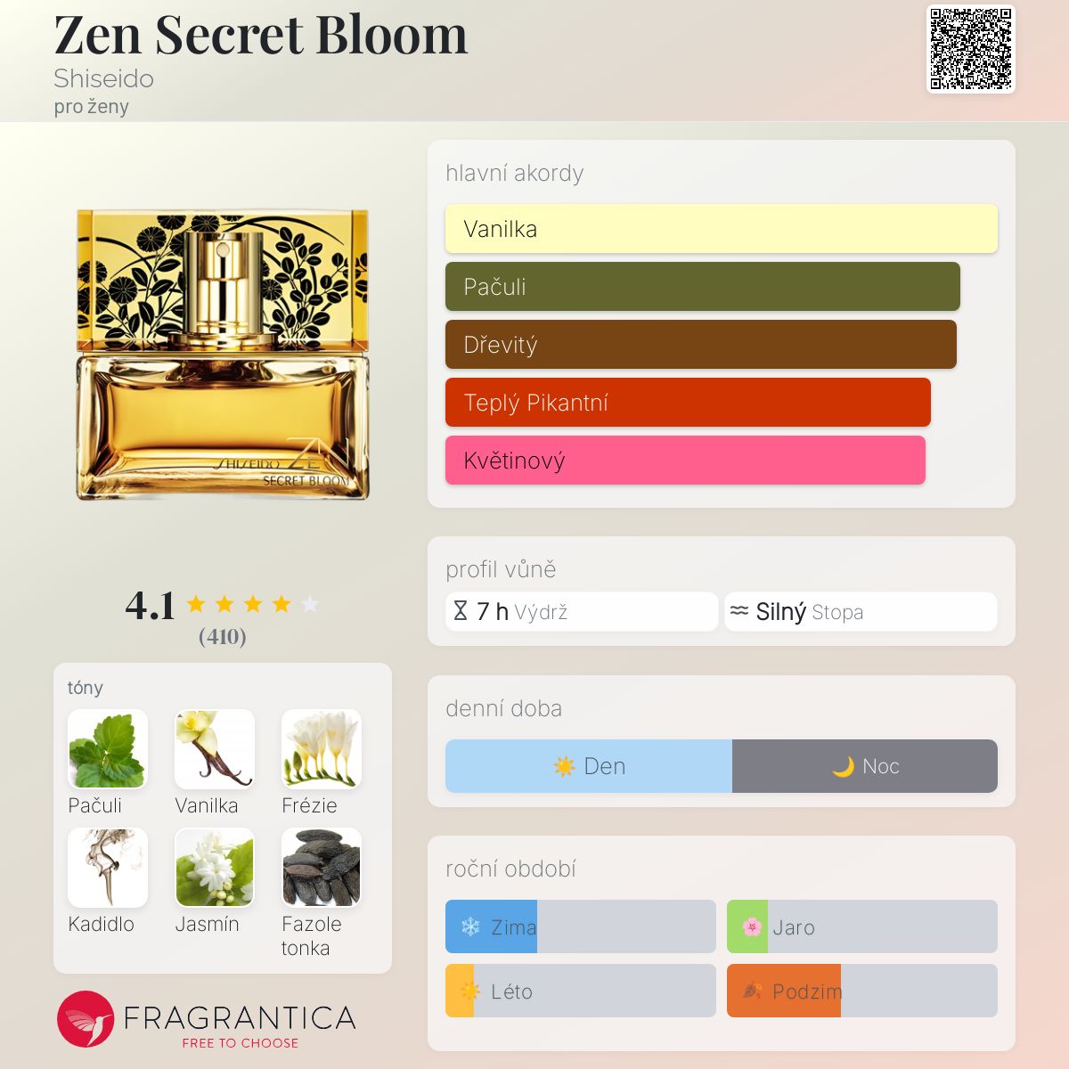 Zen Secret Bloom podle Shiseido je Chypre Floral vůně pro ženy. Zen Secret Bloom byl/a uveden/a v roce 2012. "Nosem" za touto vůní je Michel Almairac. Vrchní tóny jsou Růžový pepř, Modrá růže, Mandarinka, Grapefruit a Bergamot; střední tóny jsouFrézie, Jasmín a Gardénie ; základní tóny jsou Pačuli, Černý vanilkový lusk, Kadidlo, Fazole tonka, Pižmo, Santalové dřevo a Vetiver.