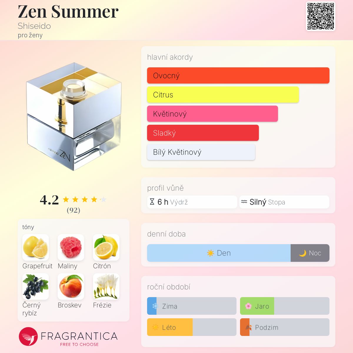 Zen Summer podle Shiseido je Floral Fruity vůně pro ženy. Zen Summer byl/a uveden/a v roce 2009. Vrchní tóny jsou Grapefruit, Citron amalfi , Černý rybíz, Broskev a Zelené jablko; střední tóny jsouFrézie, Lotus, Gardénie, Růže a Konvalinka ; základní tóny jsou Maliny, Pižmo, Virginský cedr a Jantar (ambra).