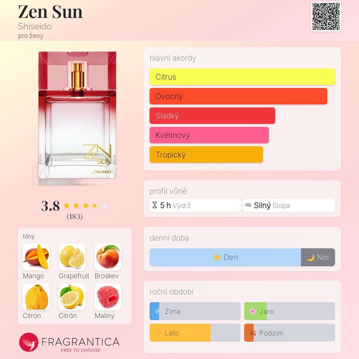 Zen Sun podle Shiseido je Floral Fruity vůně pro ženy. Zen Sun byl/a uveden/a v roce 2013. Vrchní tóny jsou Mango, Grapefruit, Broskev, Zedrát, Citrón, Bergamot a Černý rybíz; střední tóny jsouLotus, Gardénie, Třešňový květ, Modrá růže a Konvalinka ; základní tóny jsou Maliny, Jantar (ambra) a Santalové dřevo.