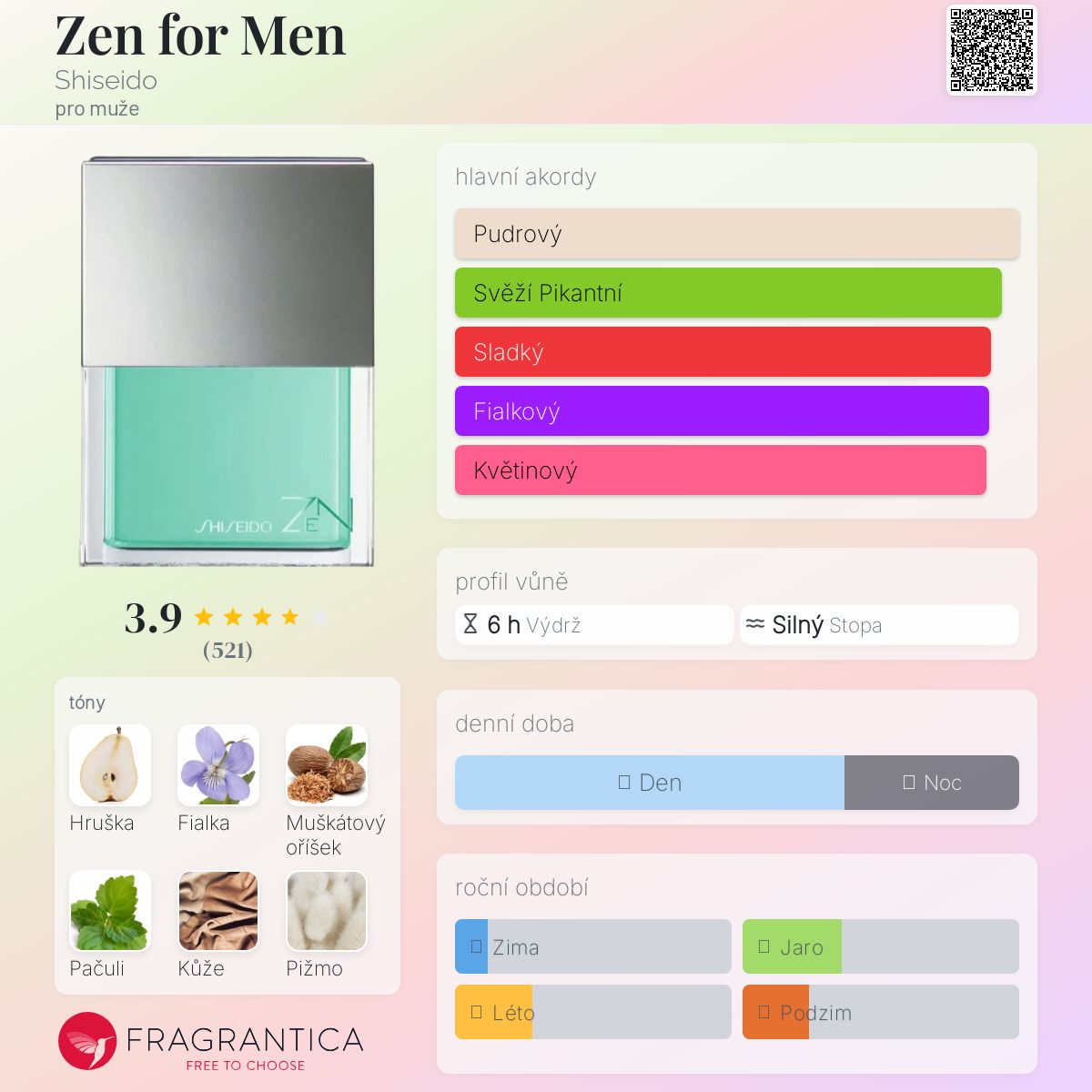 Zen for Men podle Shiseido je Aromatic vůně pro muže. Zen for Men byl/a uveden/a v roce 2009. Vrchní tóny jsou Hruška, Pomeranč a Bergamot; střední tóny jsouFialka, Muškátový oříšek a Alpská růže ; základní tóny jsou Pačuli, Pižmo a Kůže.