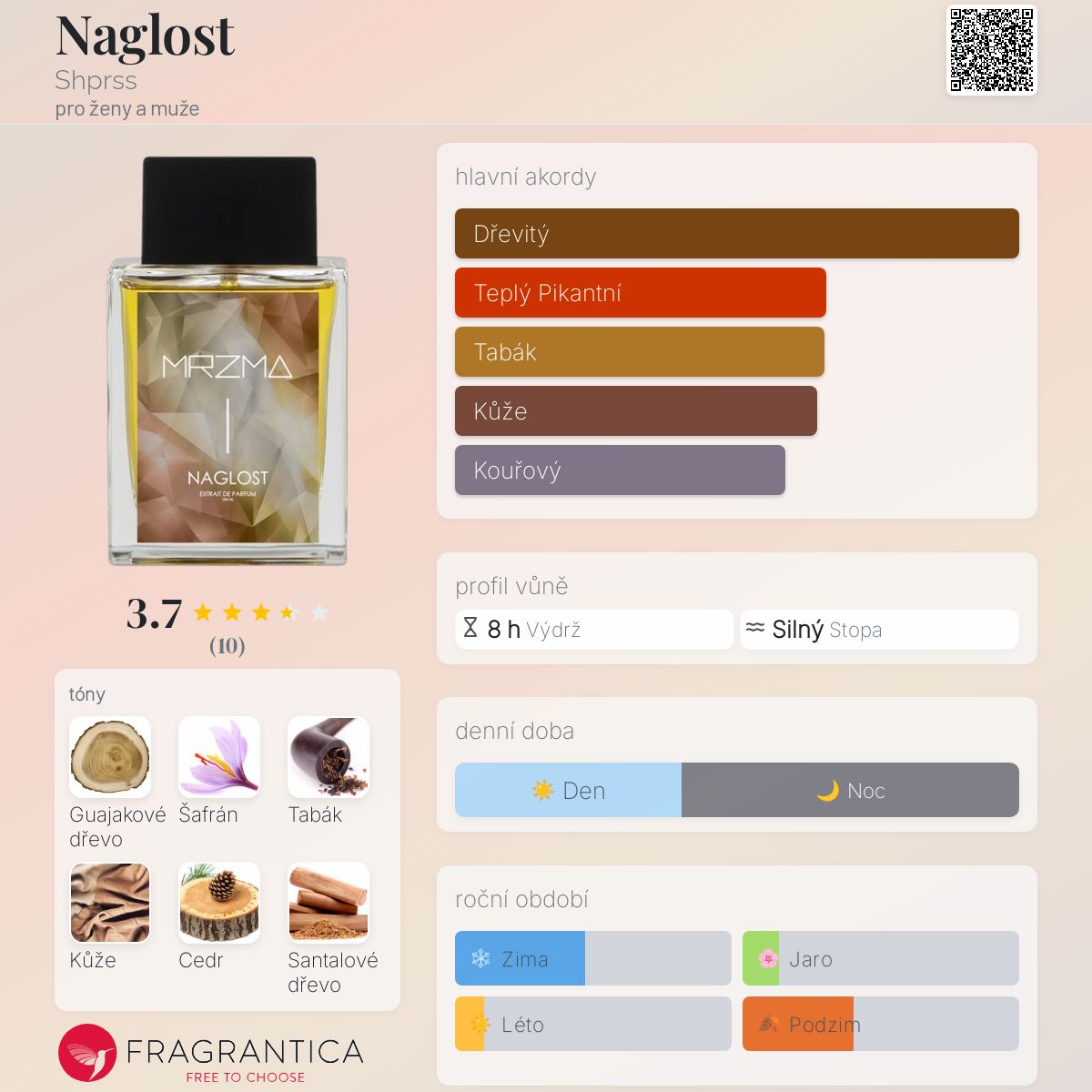 Naglost podle Shprss je Leather vůně pro ženy a muže. Naglost byl/a uveden/a v roce 2022. "Nosem" za touto vůní je MG Gulcicek. Vrchní tóny jsou Šafrán, Bergamot a Mandarinka; střední tóny jsouGuajakové dřevo, Tabák, Kadidlo a Jantar (ambra) ; základní tóny jsou Kůže, Cedr, Santalové dřevo, Bílé pižmo a Vanilka.
