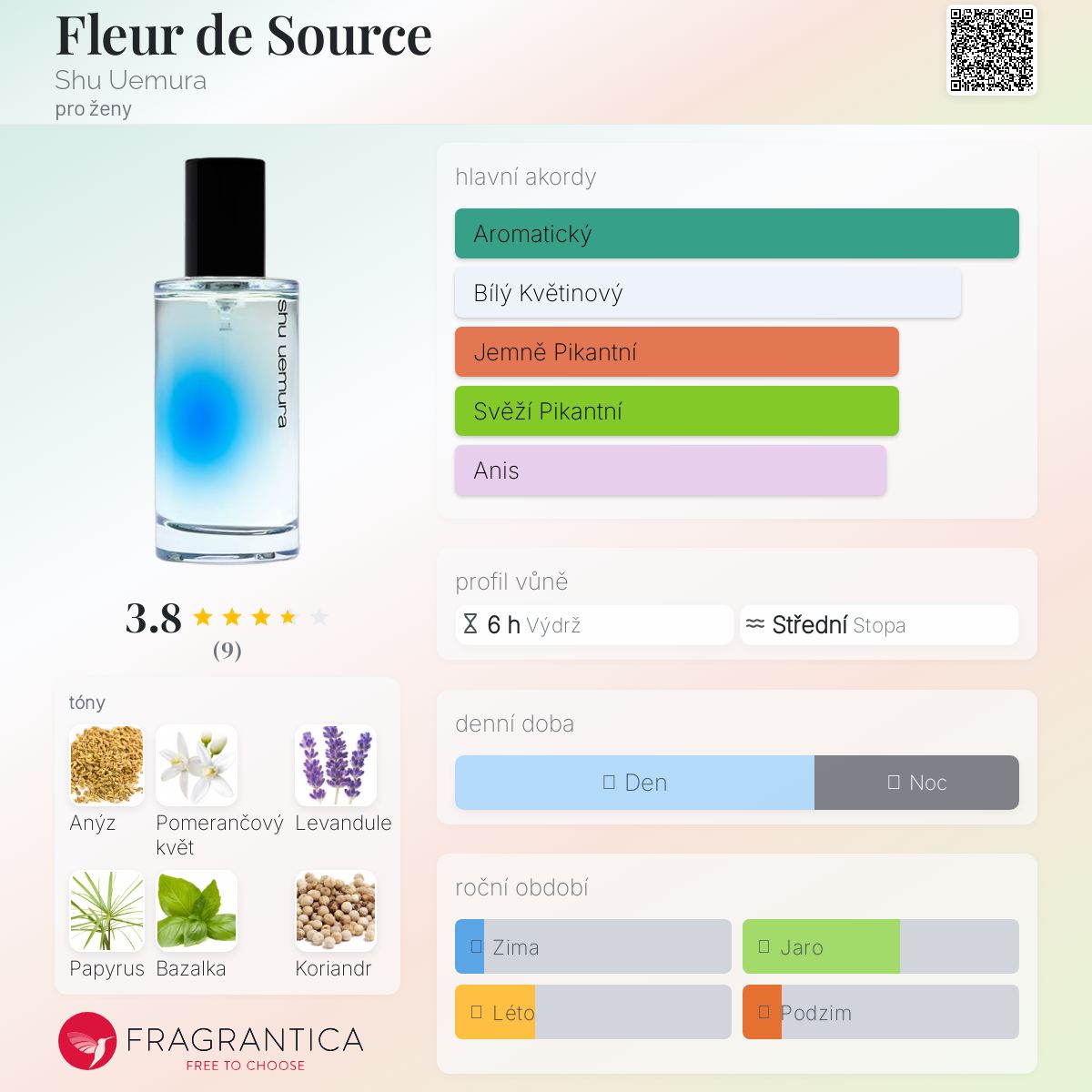 Fleur de Source podle Shu Uemura je Citrus Aromatic vůně pro ženy. Fleur de Source byl/a uveden/a v roce 2008. "Nosem" za touto vůní je Jacques Fiori. Vrchní tóny jsou Anýz, Levandule, Papyrus a Citrón; střední tóny jsouPomerančový květ a Jasmín ; základní tóny jsou Bazalka a Koriandr.