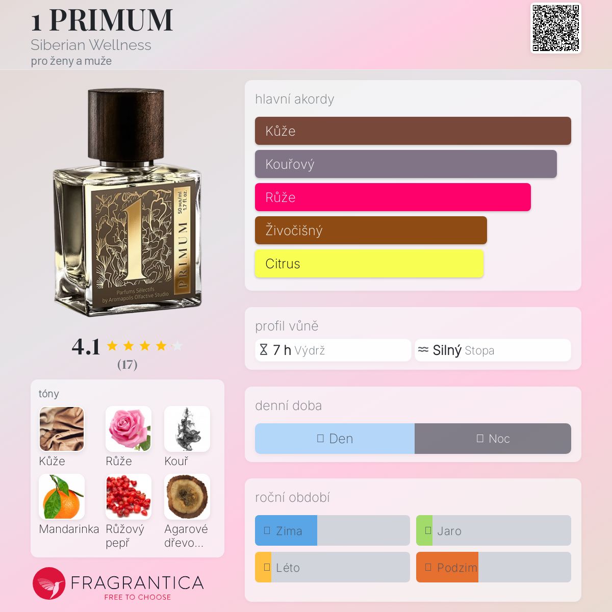 1 PRIMUM podle Siberian Wellness je vůně pro ženy a muže. 1 PRIMUM byl/a uveden/a v roce 2021. "Nosem" za touto vůní je Angéline Leporini. Vrchní tóny jsou Mandarinka, Růžový pepř a Kořeněné tóny; střední tóny jsouKůže, Okvětní lístky růží a Jantar (ambra) ; základní tóny jsou Kouř, Agarové dřevo (oud), Pryskyřice, Kašmír a Pižmo.