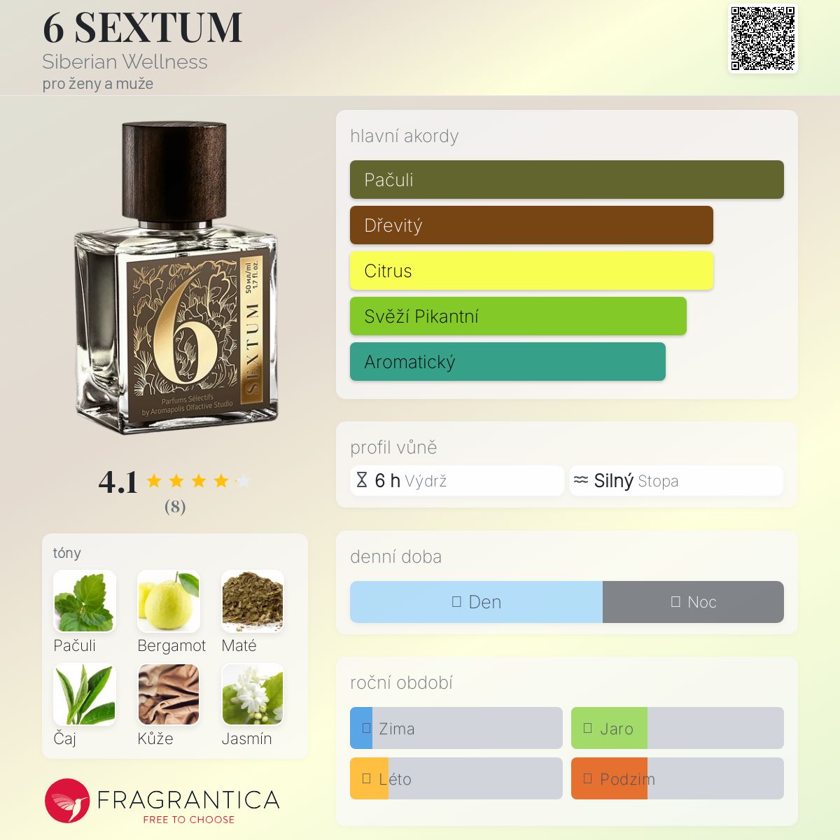 6 SEXTUM podle Siberian Wellness je Orientální Spicy vůně pro ženy a muže. 6 SEXTUM byl/a uveden/a v roce 2021. "Nosem" za touto vůní je Julia Rodriguez Pastor. Vrchní tóny jsou Bergamot a Černý čaj; střední tóny jsouKůže, Čajový lístek a Jasmín ; základní tóny jsou Pačuli, Maté a Jantar (ambra).