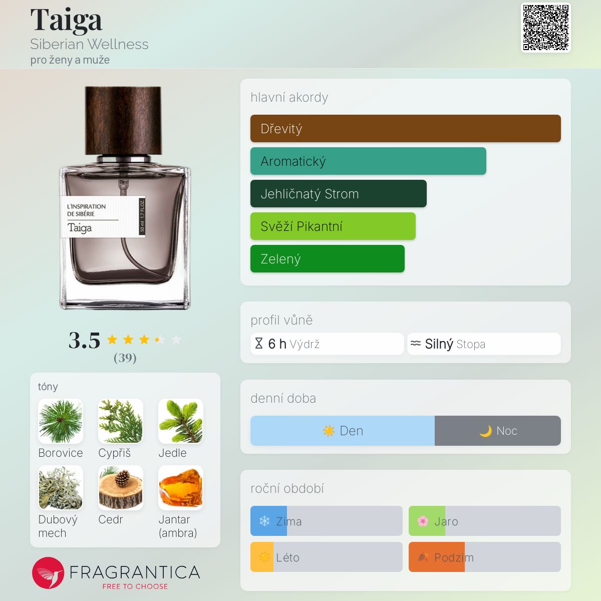 Taiga podle Siberian Wellness je Woody vůně pro ženy a muže. Taiga byl/a uveden/a v roce 2017. "Nosem" za touto vůní je Bertrand Duchaufour. Vrchní tóny jsou Cypřiš, Cedrové jehly a Kardamom; střední tóny jsouSibiřská borovice a Ozonové tóny ; základní tóny jsou Mech, Cedr, Jantar (ambra), Jedle balzámová, Pačuli a Santalové dřevo.