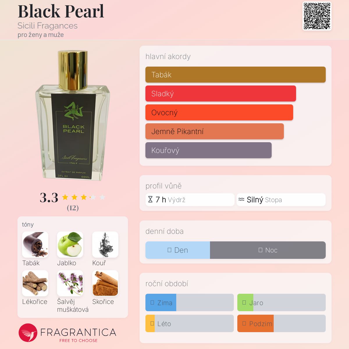 Black Pearl podle Sicili Fragances je Orientální Spicy vůně pro ženy a muže. Black Pearl byl/a uveden/a v roce 2022. "Nosem" za touto vůní je Salvador Castellanos. Vrchní tóny jsou Jablko, Kouř a Skořice; střední tóny jsouTabák, Vanilka a Mech ; základní tóny jsou Lékořice, Šalvěj muškátová, Bourbonská vanilka a Iso E Super.
