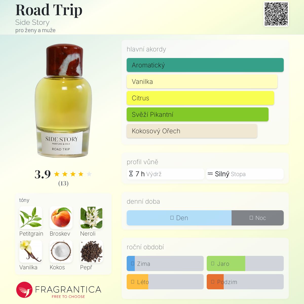 Road Trip podle Side Story je Floral vůně pro ženy a muže. Road Trip byl/a uveden/a v roce 2022. Road Trip byl/a vytvořen/a Jacques Chabert a Argeville. Vrchní tóny jsou Petitgrain a Broskev; střední tóny jsouNeroli, Pepř a Šalvěj muškátová ; základní tóny jsou Vanilka, Kokos, Santalové dřevo a Vetiver.
