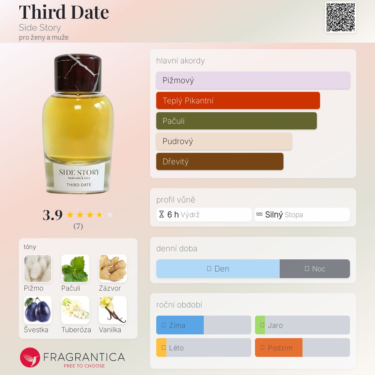 Third Date podle Side Story je Aromatic vůně pro ženy a muže. Third Date byl/a uveden/a v roce 2022. Third Date byl/a vytvořen/a Jacques Chabert a Argeville. Vrchní tóny jsou Zázvor a Švestka; střední tóny jsouPačuli a Tuberóza ; základní tóny jsou Pižmo a Vanilka.