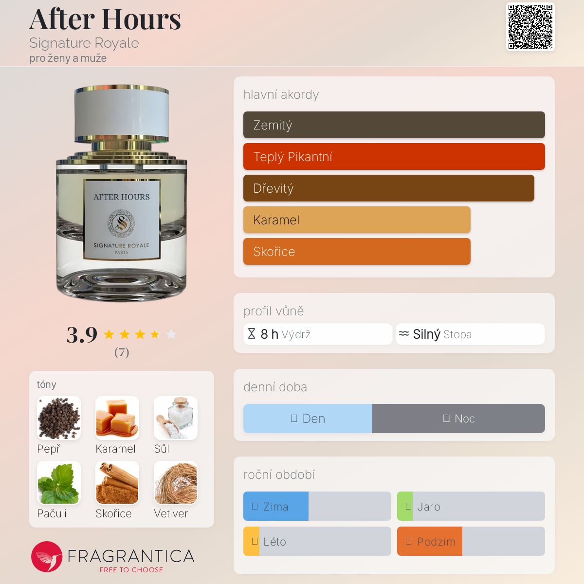 After Hours podle Signature Royale je Aromatic Spicy vůně pro ženy a muže. After Hours byl/a uveden/a v roce 2023. Vrchní tóny jsou Černý pepř, Karamel a Sůl; střední tóny jsouPačuli, Skořice, Vetiver a Mech ; základní tóny jsou Vanilka a Jantar (ambra).