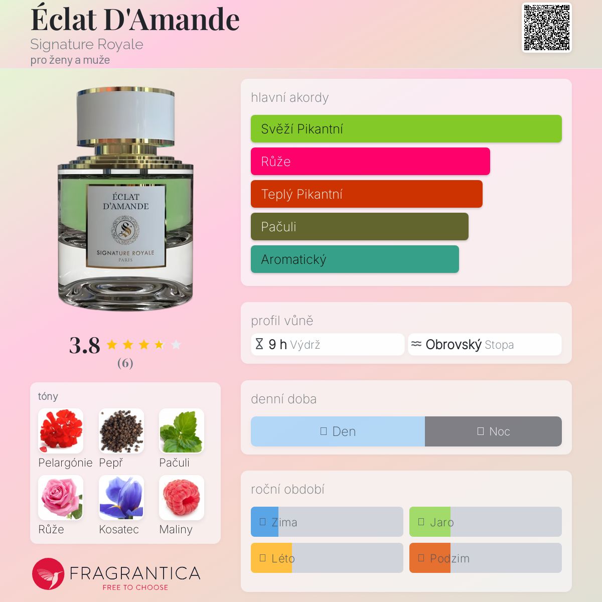 Éclat D'Amande podle Signature Royale je Floral Woody Musk vůně pro ženy a muže. Éclat D'Amande byl/a uveden/a v roce 2023. Vrchní tóny jsou Pelargónie, Maliny a Mandle; střední tóny jsouČerný pepř, Pačuli, Růže a Kosatec ; základní tóny jsou Vanilka, Jantar (ambra) a Pižmo.