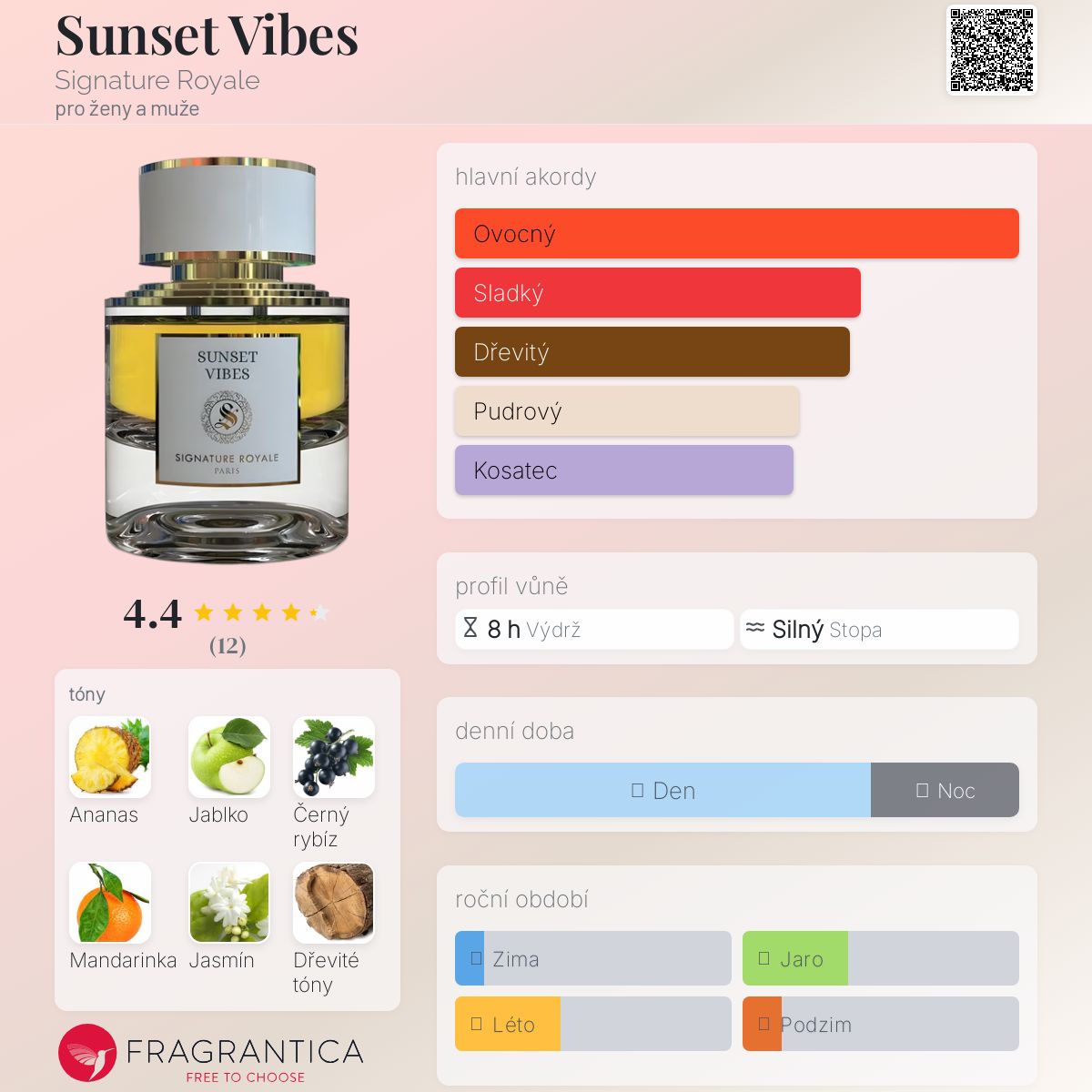 Sunset Vibes podle Signature Royale je Floral Fruity vůně pro ženy a muže. Sunset Vibes byl/a uveden/a v roce 2023. Vrchní tóny jsou Ananas, Jablko, Černý rybíz a Mandarinka; střední tóny jsouJasmín Sambac, Bílé dřevo a Tabák ; základní tóny jsou Vanilka, Jantar (ambra) a Kosatec.