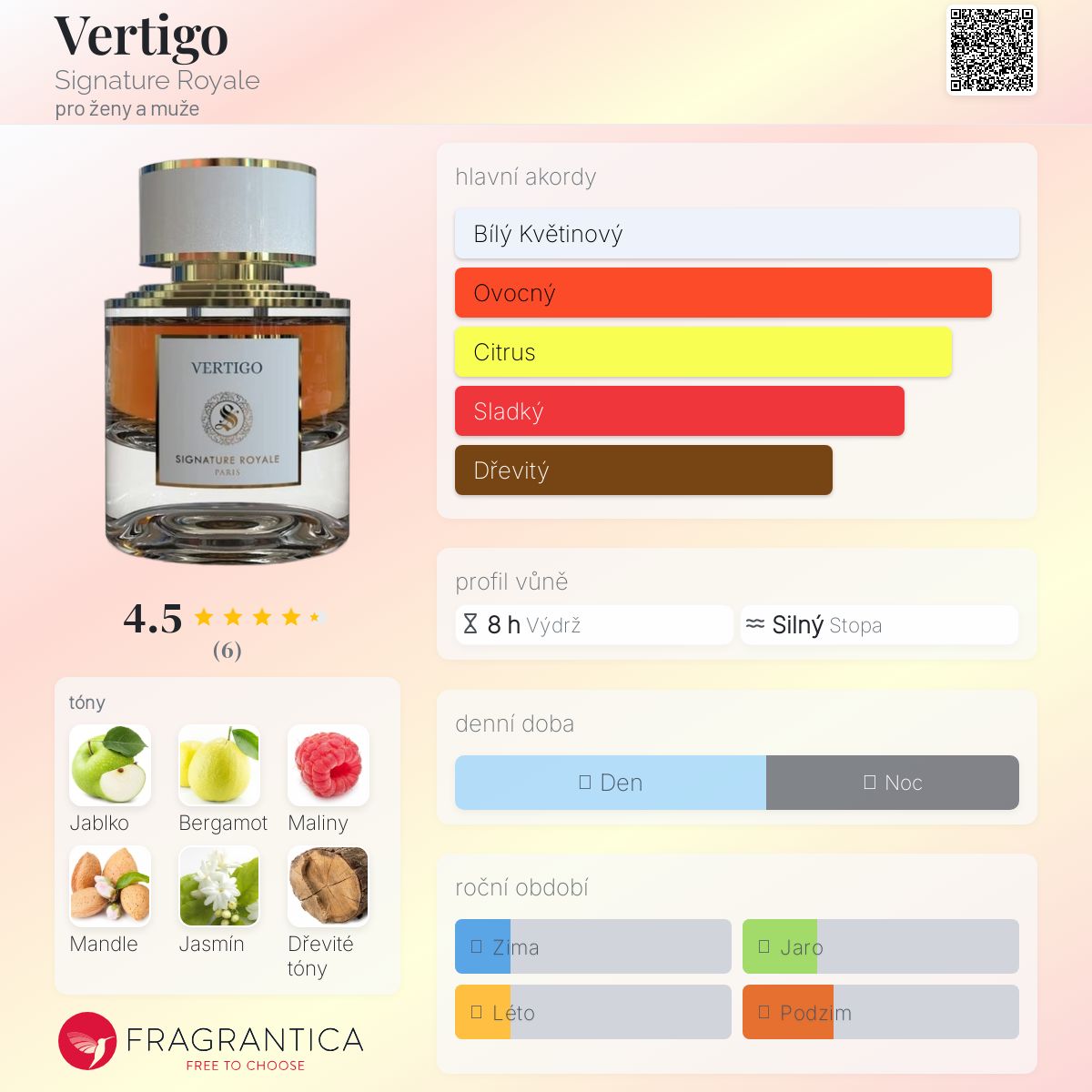 Vertigo podle Signature Royale je Floral Fruity vůně pro ženy a muže. Vertigo byl/a uveden/a v roce 2023. Vrchní tóny jsou Jablko, Bergamot, Maliny a Mandle; střední tóny jsouJasmín, Bílé dřevo, Neroli a Pomerančový květ ; základní tóny jsou Vanilka, Jantar (ambra) a Pižmo.