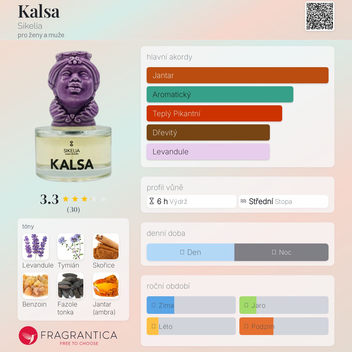 Kalsa podle Sikelia je Orientální Woody vůně pro ženy a muže. Kalsa byl/a uveden/a v roce 2022. Vrchní tóny jsou Tymián a Neroli; střední tóny jsouLevandule, Skořice, Labdanum a Ylang-Ylang ; základní tóny jsou Benzoin, Fazole tonka, Jantar (ambra), Santalové dřevo, Cedr a Pižmo.