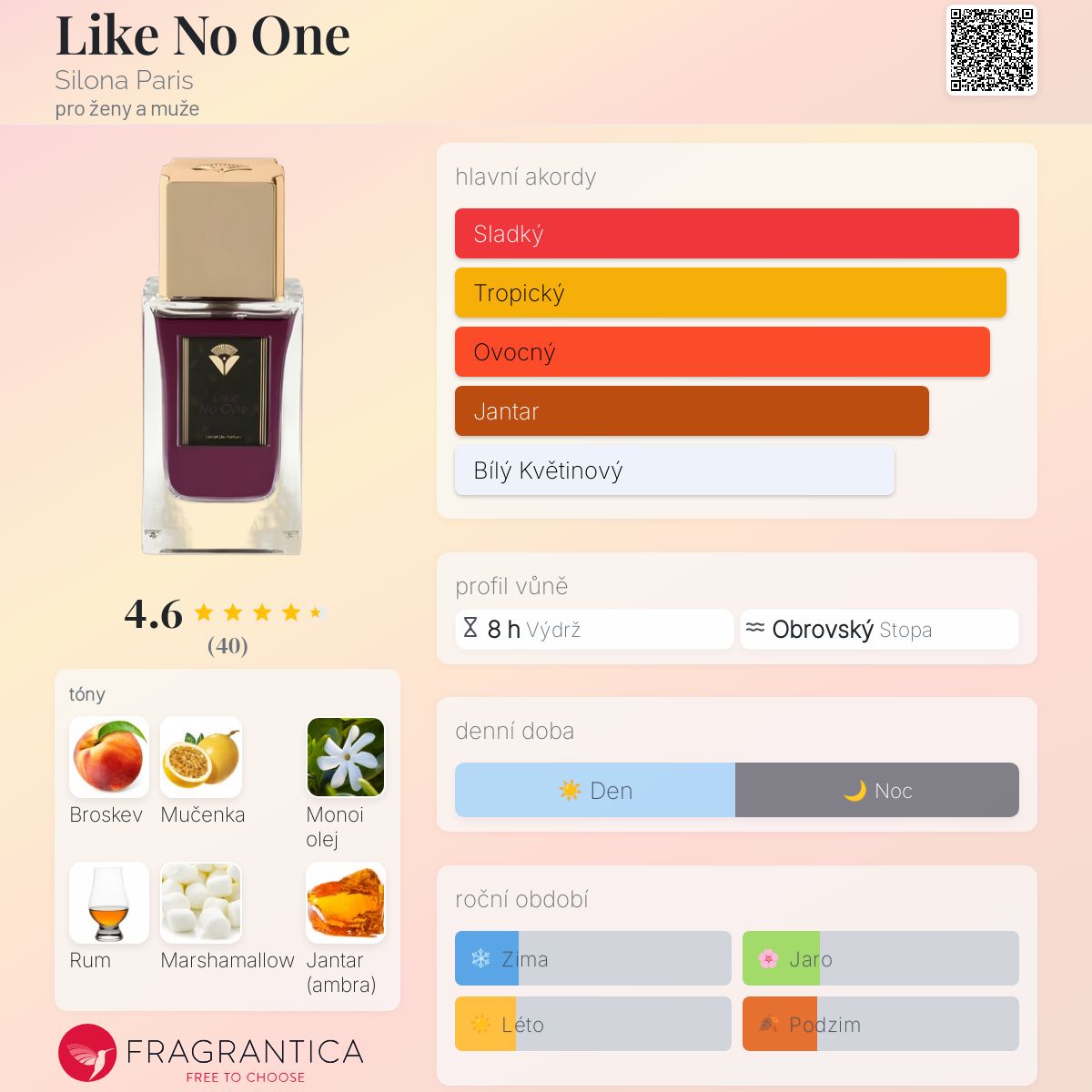 Like No One podle Silona Paris je Orientální Floral vůně pro ženy a muže. Toto je nová vůně. Like No One byl/a uveden/a v roce 2025. "Nosem" za touto vůní je Margaux Le Paih Guérin. Vrchní tóny jsou Broskev, Mučenka, Cejlonská skořice a Zázvor; střední tóny jsouMonoi olej a Jasmín ; základní tóny jsou Rum, Marshmallow, Jantar (ambra), Bílé pižmo a Ambroxan.