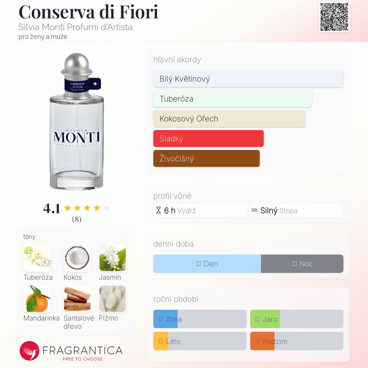 Conserva di Fiori podle Silvia Monti Profumi d'Artista je vůně pro ženy a muže. Conserva di Fiori byla spuštěna během 2020. "Nosem" za touto vůní je Silvia Monti. Vrchní tóny jsou Italská mandarinka, Bergamot a Cypřiš; střední tóny jsouIndická tuberóza, Kokos, Jasmín Sambac a Heřmánek ; základní tóny jsou Australské santalové dřevo, Pižmo, Papyrus a Atlasový cedr.